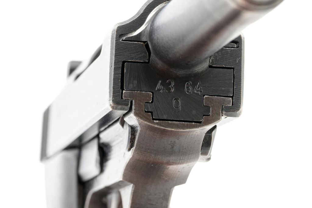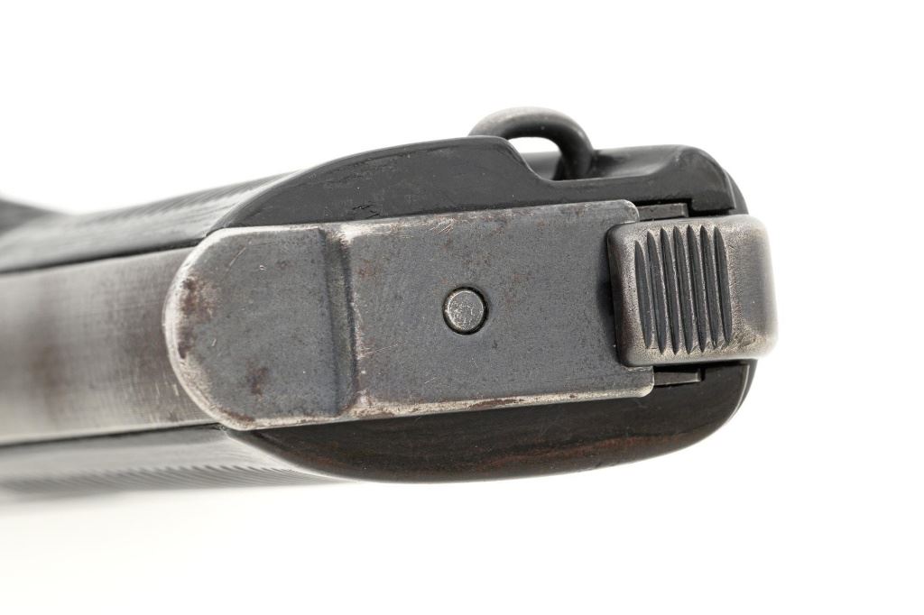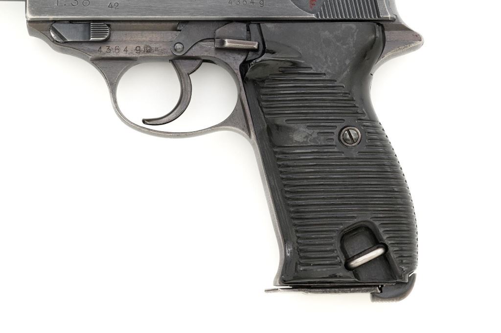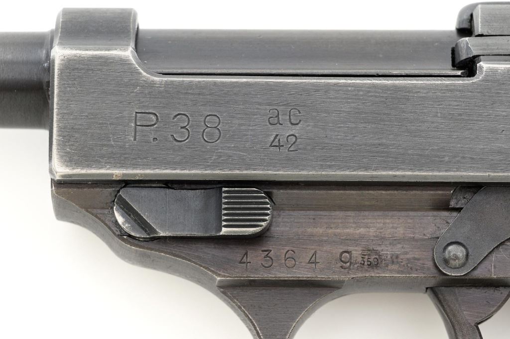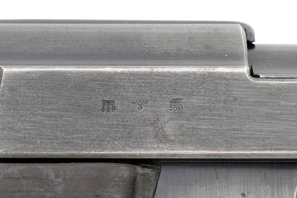 Walther ac42 P.38 Semi-Automatic Pistol, #4364g, 9mm cal., 5" barrel, blued finish, grooved black plastic grips, dovetailed blade front sight, and "U"-notched rear sight. Includes one blued steel magazine, marked "P.38v/U". Magazine follower is early flat type. Left side of the slide is marked "P.38/ac42" and the right side is stamped with two "(eagle)359" Waffenamts and Nazi eagle firing proof. There are additional "(eagle)359" proofs on left side of the frame and barrel. Locking block is marked "(eagle)359", firing proof, and "W". Matching numbers. No visible import marks. Condition overall is very good, retaining approx. 80% factory blue, with wear primarily to the edges and front grip strap. There are a few shallow impressions visible on the trigger guard. Grips are very good and display moderate signs of age and wear, with intermittent light scratches to the right grip. Action and hammer drop operate smoothly. Bore is primarily bright, there is a little frosting forward of the chamber, and rifling is good. Magazine shows moderate finish wear with a few spots of cleaned pitting on the sides. Est.: $800-$1,200. (C&R/PPT)