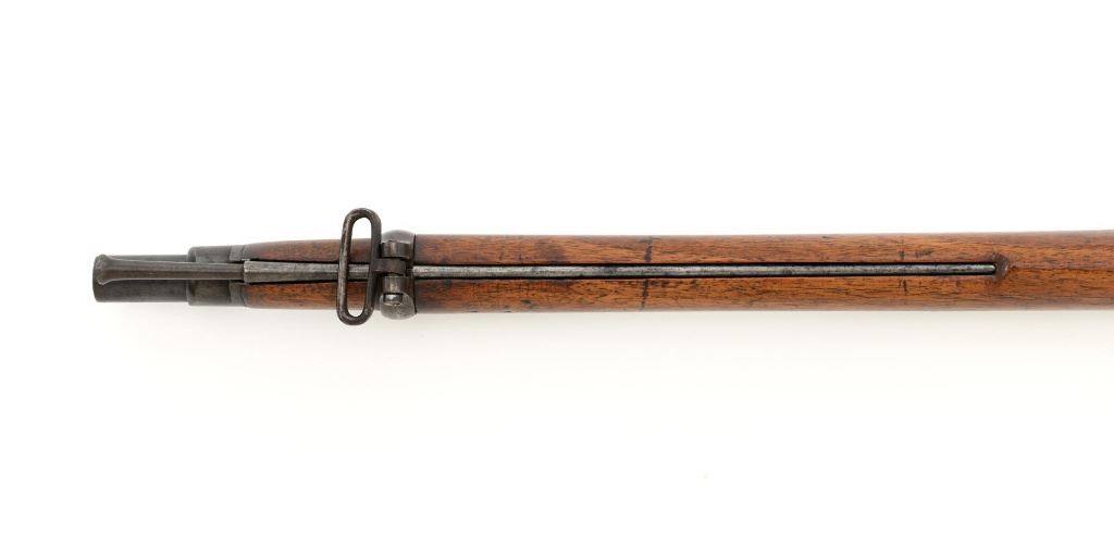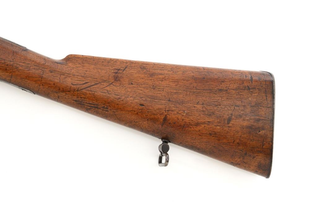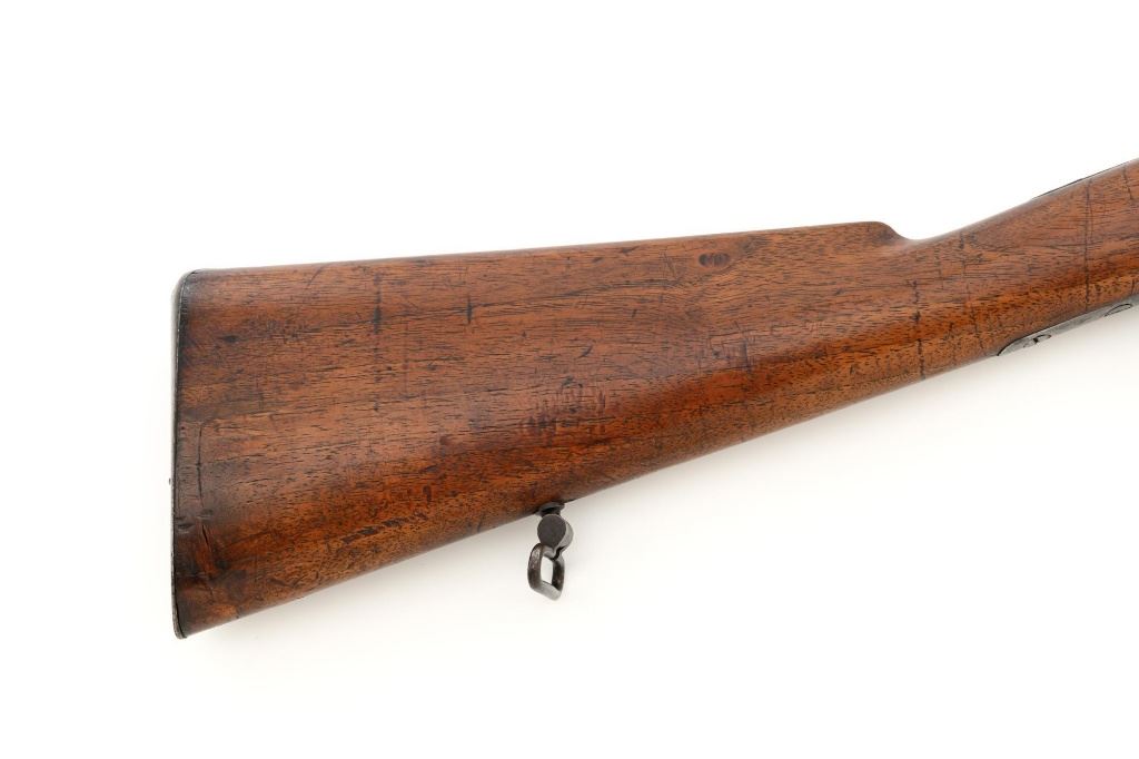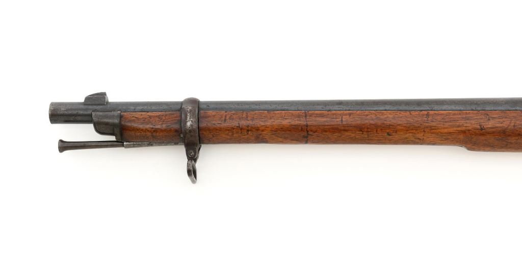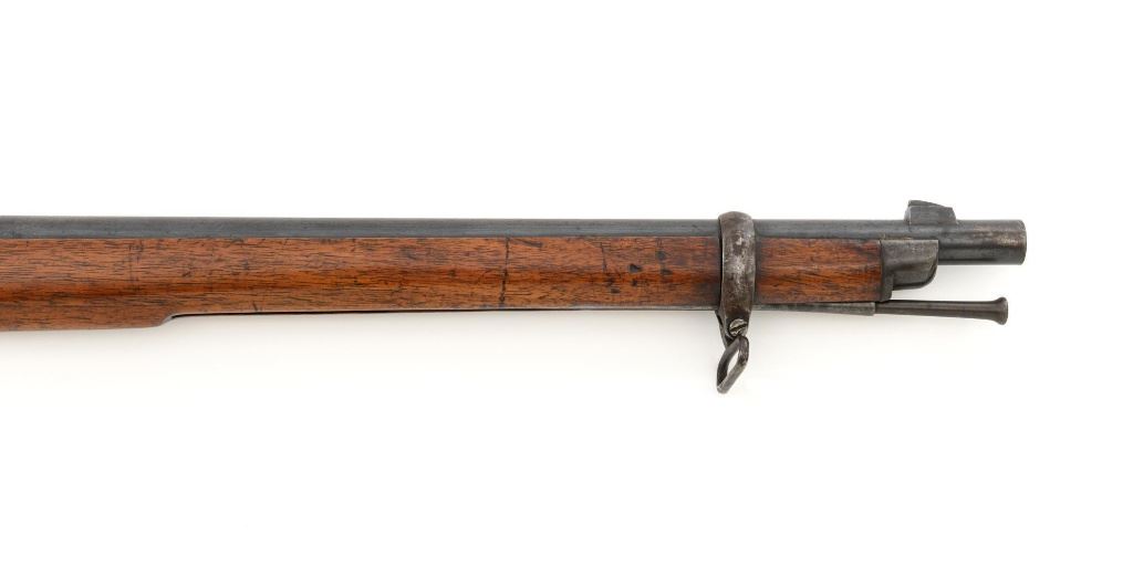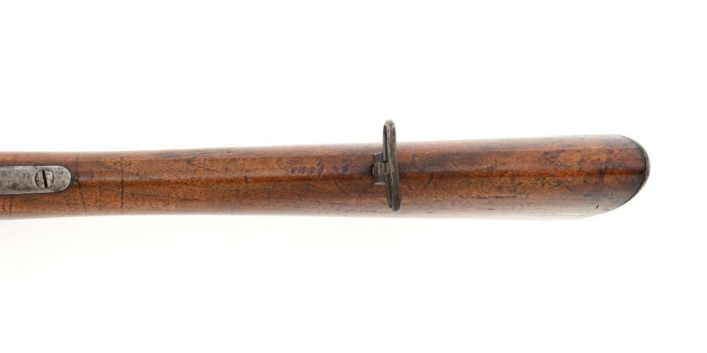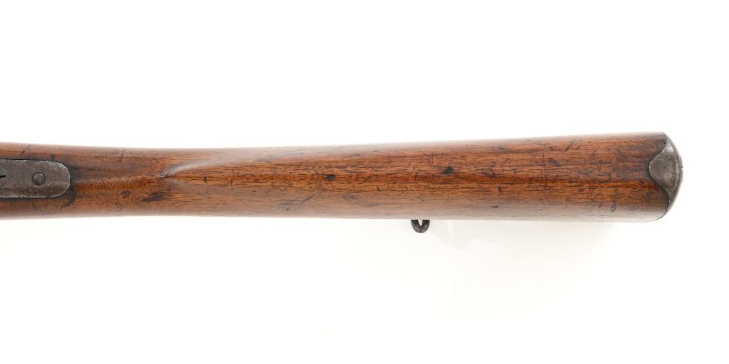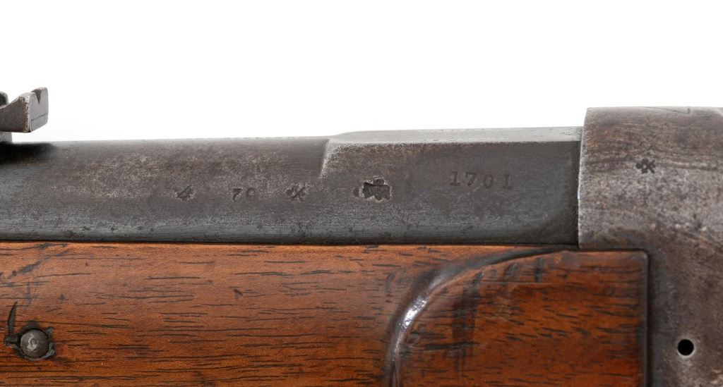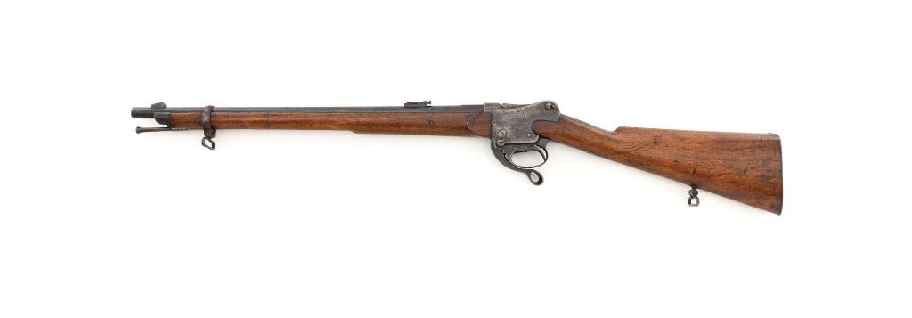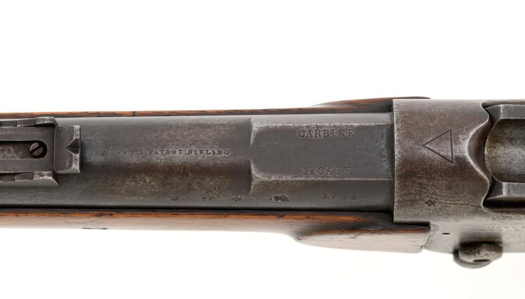Westley Richards 1869 Improved Martini Falling Block Single Shot Carbine, #1701, .450 1-1/2" case cal., 22" round barrel, blued finish, hardwood stock set, inverted-"V" front sight, adjustable folding leaf rear sight with "V"-notched groove, graduated to 800 yards. Includes steel cleaning rod and a brass cleaning tip is in the buttstock trap. Left side of the receiver is marked "MANUFACTURED BY WESTLEY RICHARDS & CO./LIMITED/BIRMINGHAM" with "WESTLEY RICHARDS PATENT" on the right side. Top of the barrel is marked "HENRYS PATENT RIFLING". Barrel knox form is marked "CARBINE/1 1/2 CASE" with "52", Proof and View stamps on the left side. There is a Westley Richards Triangle stamp on top of the chamber. Condition overall is good, retaining approx. 35%-40% thinning and toning blue. Wood is very good as lightly sanded, showing added finish applied over old handling marks and scratches. Action operates smoothly, but the breech lever is bent a little to the right side. Bore with very good Henry style rifling. Est.: $800-$1,200. (Antique)