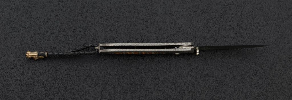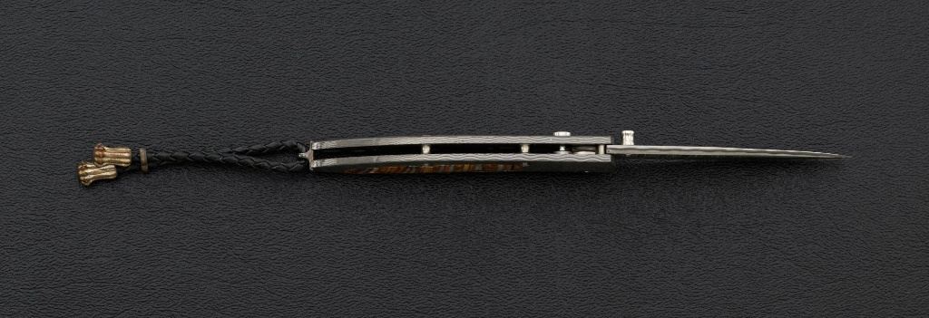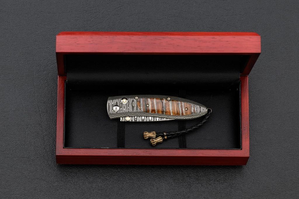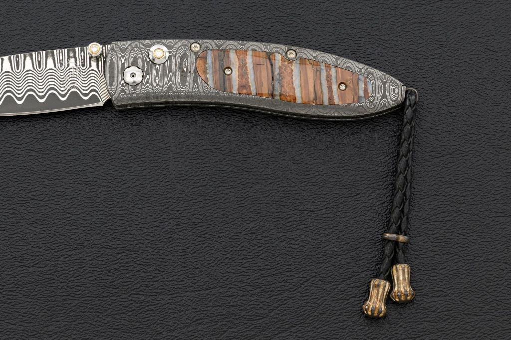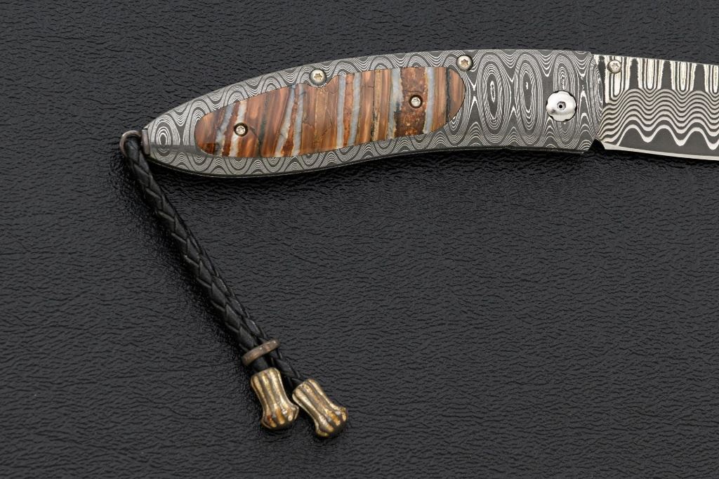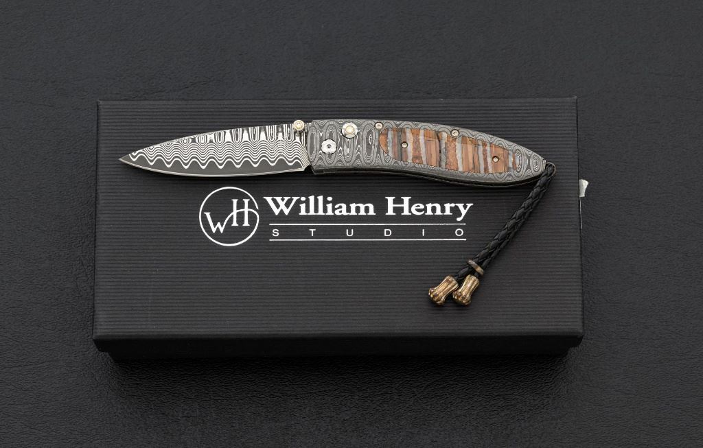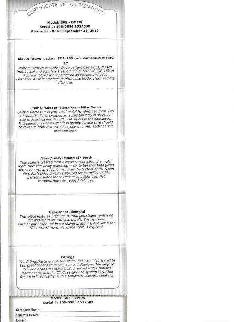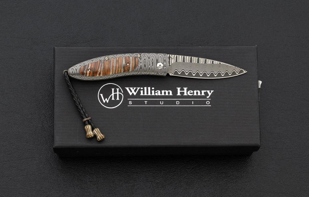 William Henry Model B05-DMTW Monarch Button Lock Folding Knife, 2.5" "Wave" patten damascus blade, 3.25" overall closed length, diamond inlaid thumb stud and button, Mike Norris "Ladder" damascus frame, resin stabilized mammoth tooth scales, and braided leather lanyard with sterling silver beads. Numbered 152/500 on front edge of the frame. Includes the original black WH box, wood presentation box, brown leather WH clipcase, and matching numbered Certificate of Authenticity. Manufactured September 21, 2010. Knife is in new condition. Boxes are in excellent condition. Est.: $1,000-$1,400.