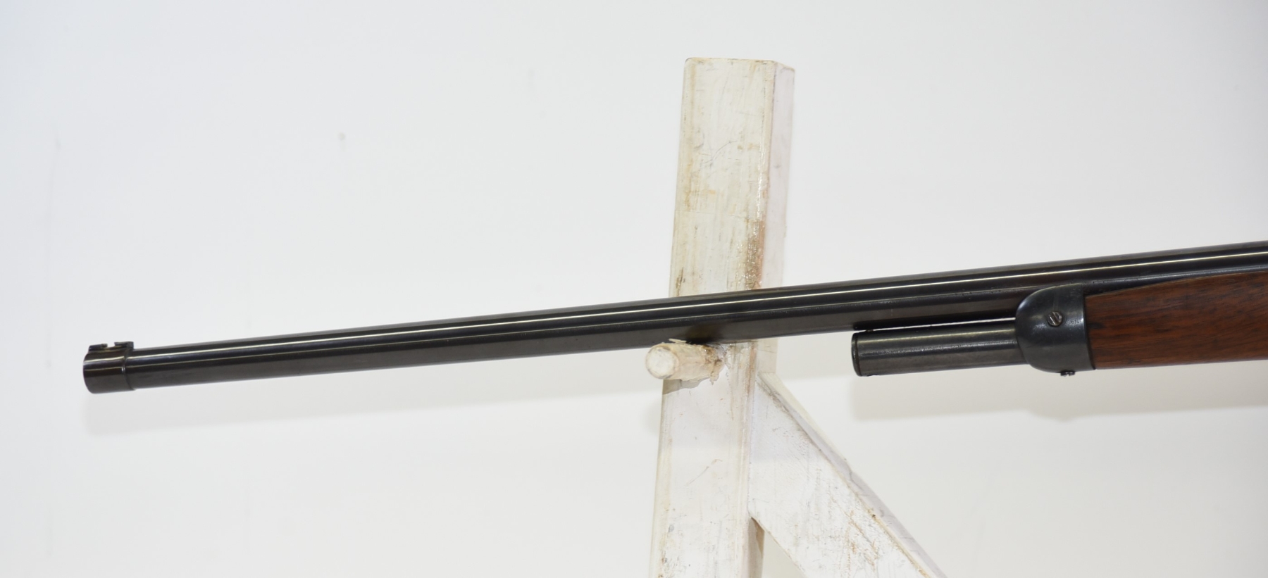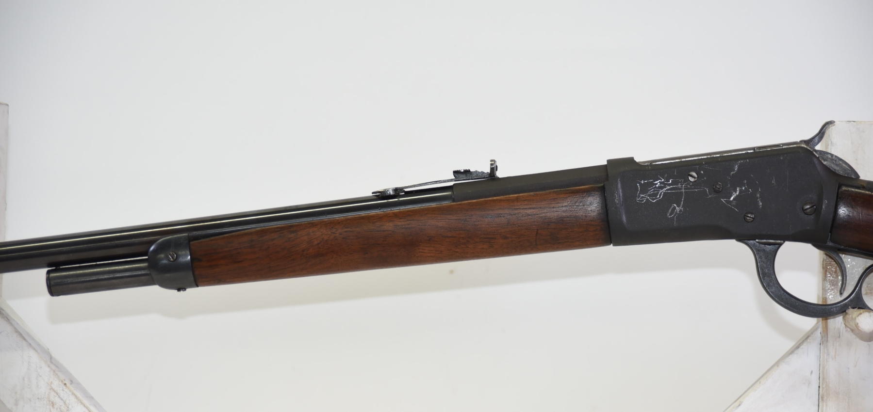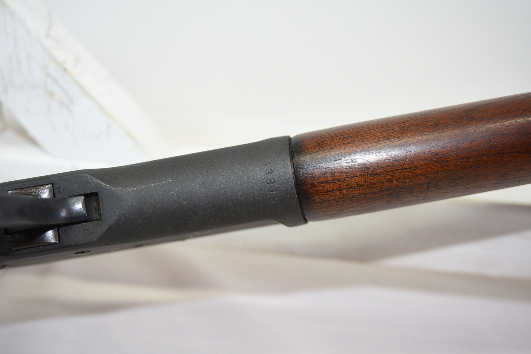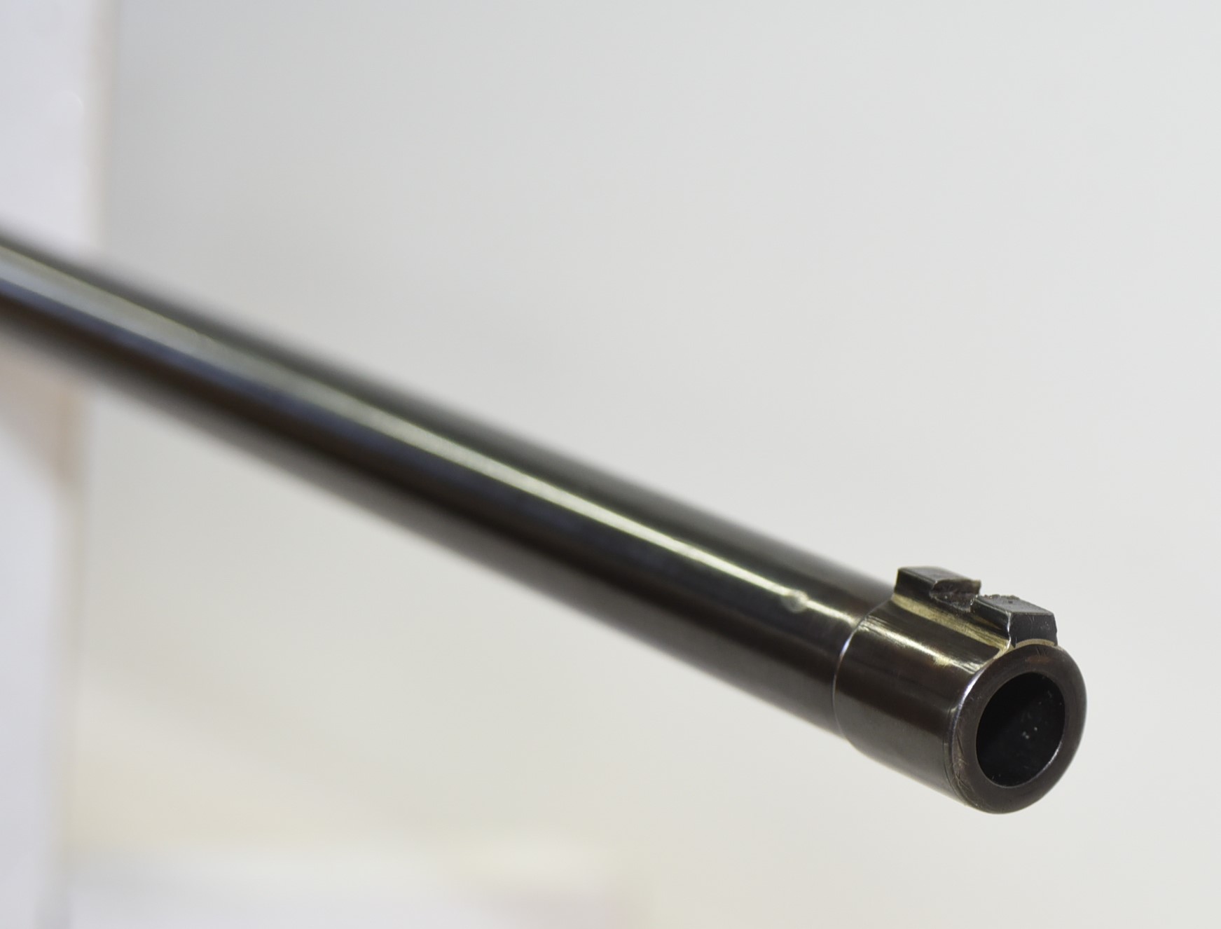 Metal finish shows firearm has been re-finished, there was a repair in the rear upper tang, barrel has been replaced/repaired, magazine tube has been cut/shortened. The front sight is missing. Condition is fair.