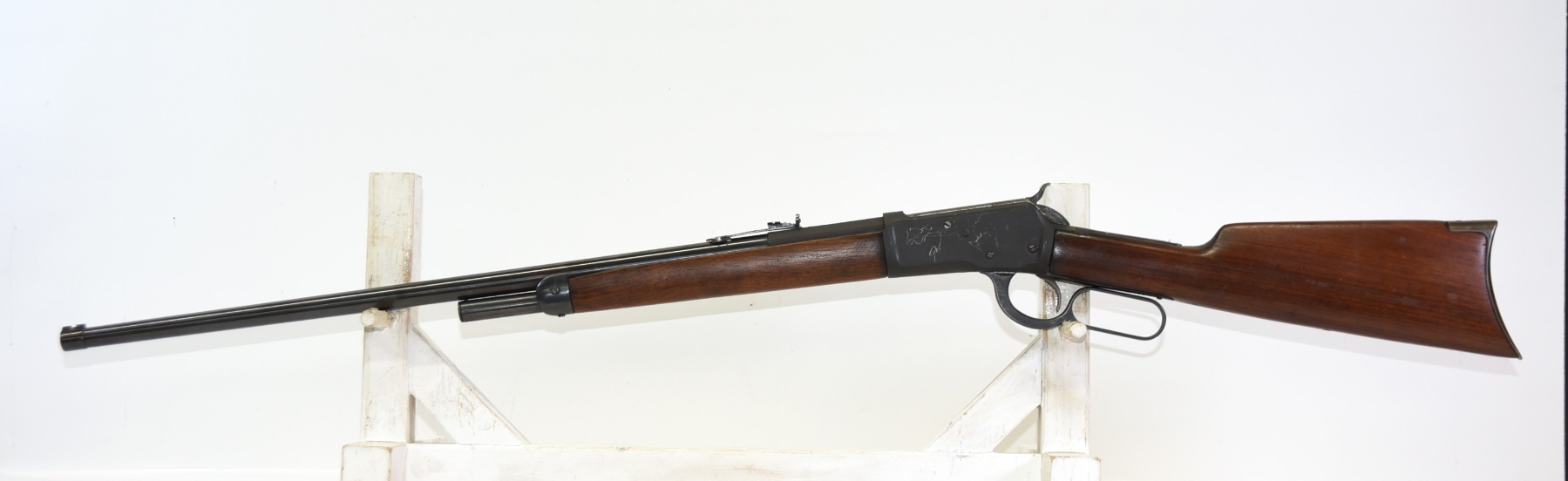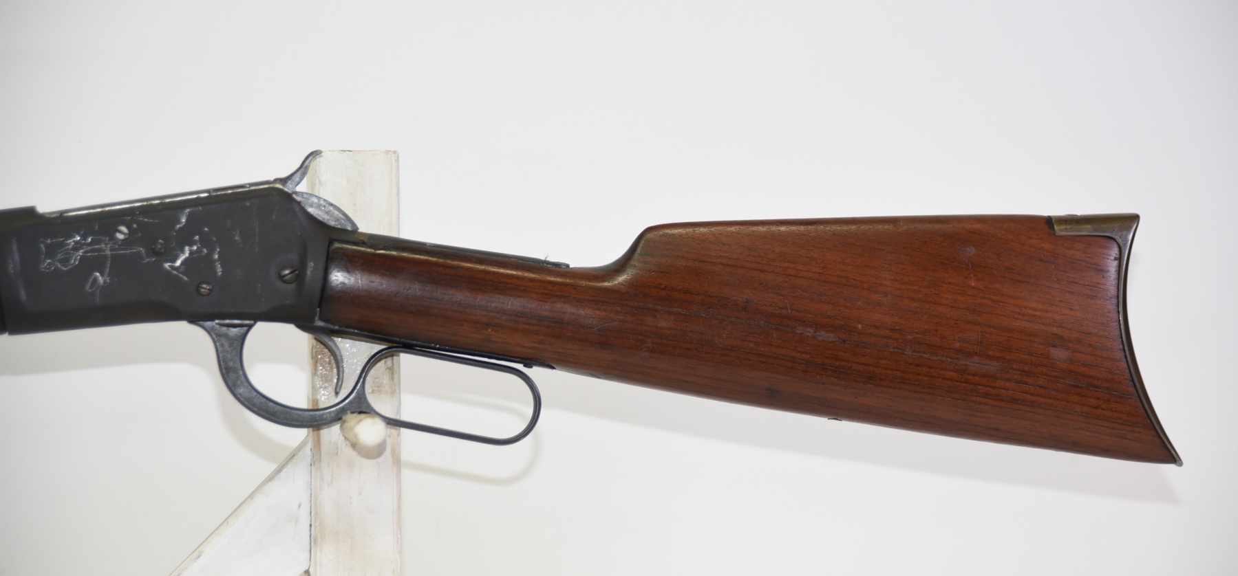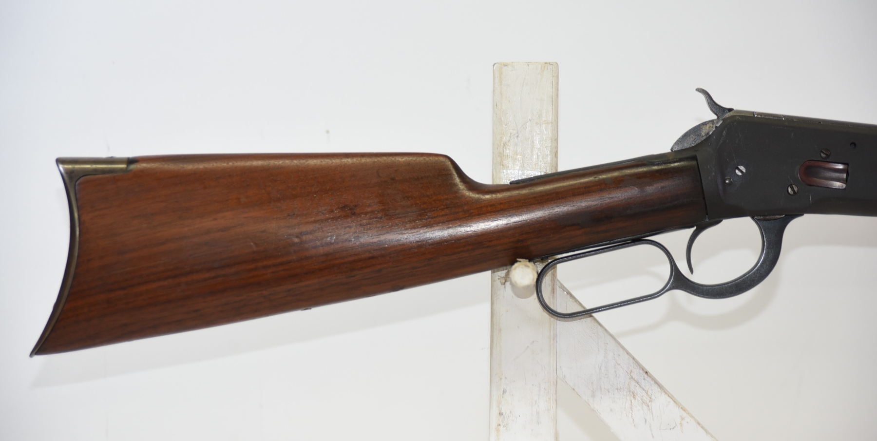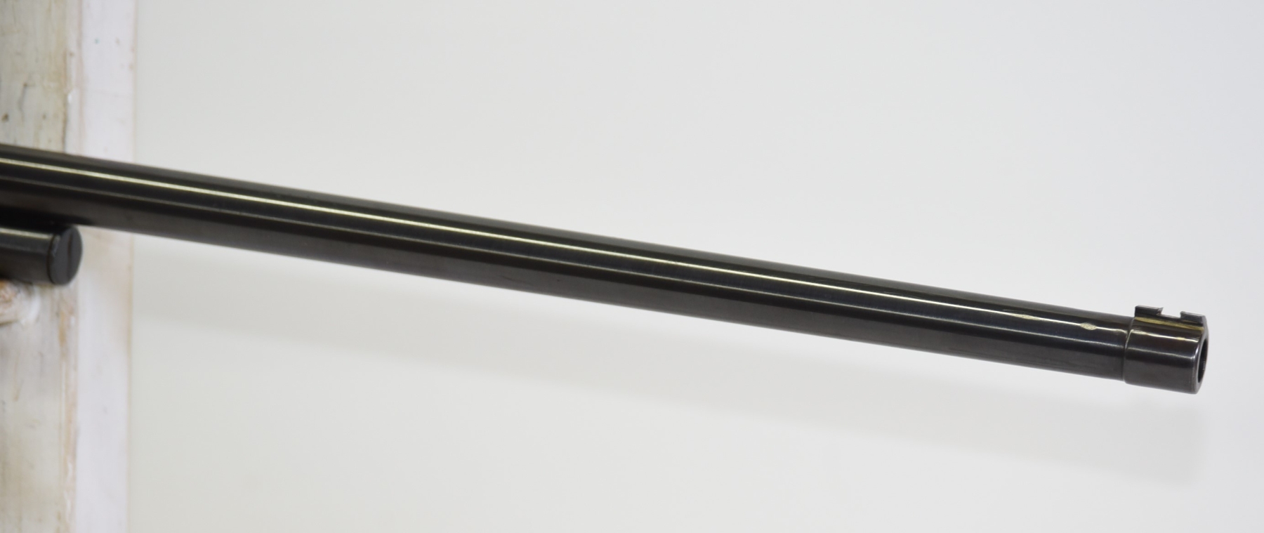 Metal finish shows firearm has been re-finished, there was a repair in the rear upper tang, barrel has been replaced/repaired, magazine tube has been cut/shortened. The front sight is missing. Condition is fair.