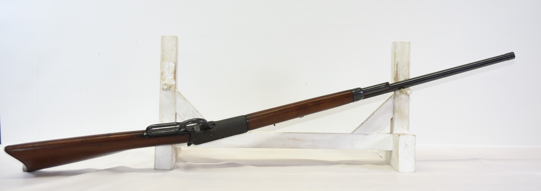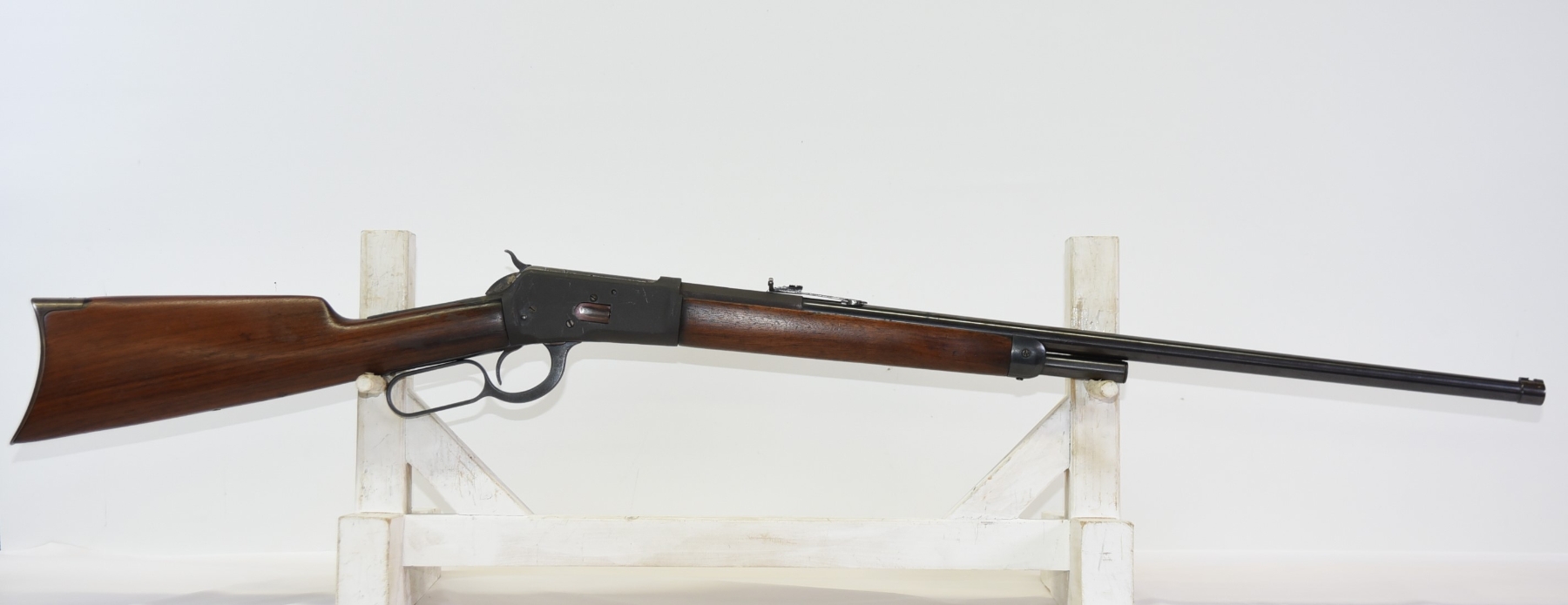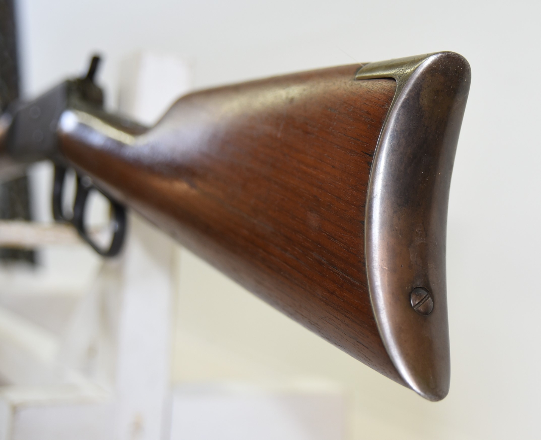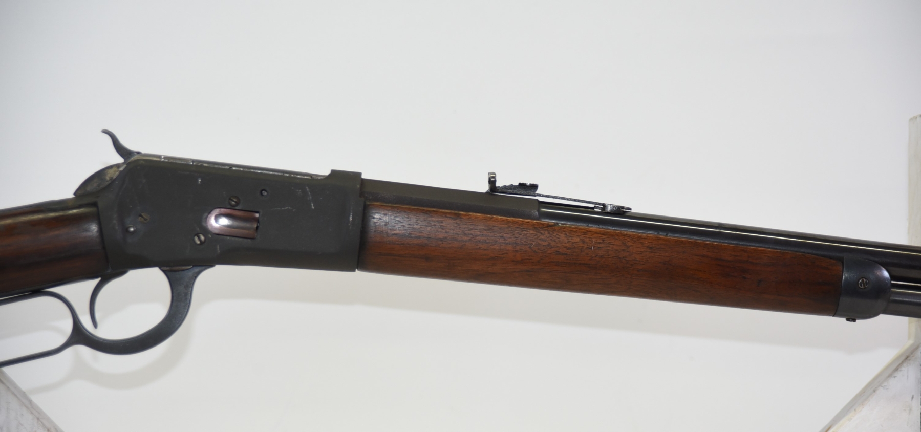 Metal finish shows firearm has been re-finished, there was a repair in the rear upper tang, barrel has been replaced/repaired, magazine tube has been cut/shortened. The front sight is missing. Condition is fair.