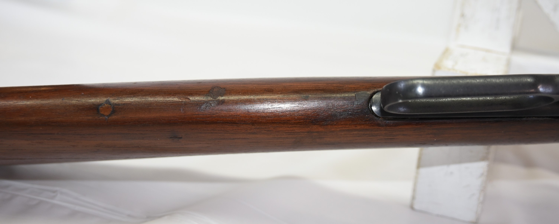 Wood stock shows long cracks on either side of the rear stock, fine hairline cracks can be seen in the forearm with some of the wood missing towards the muzzle. There are light scratches, scuffs, light dents. Condition is less than fair.