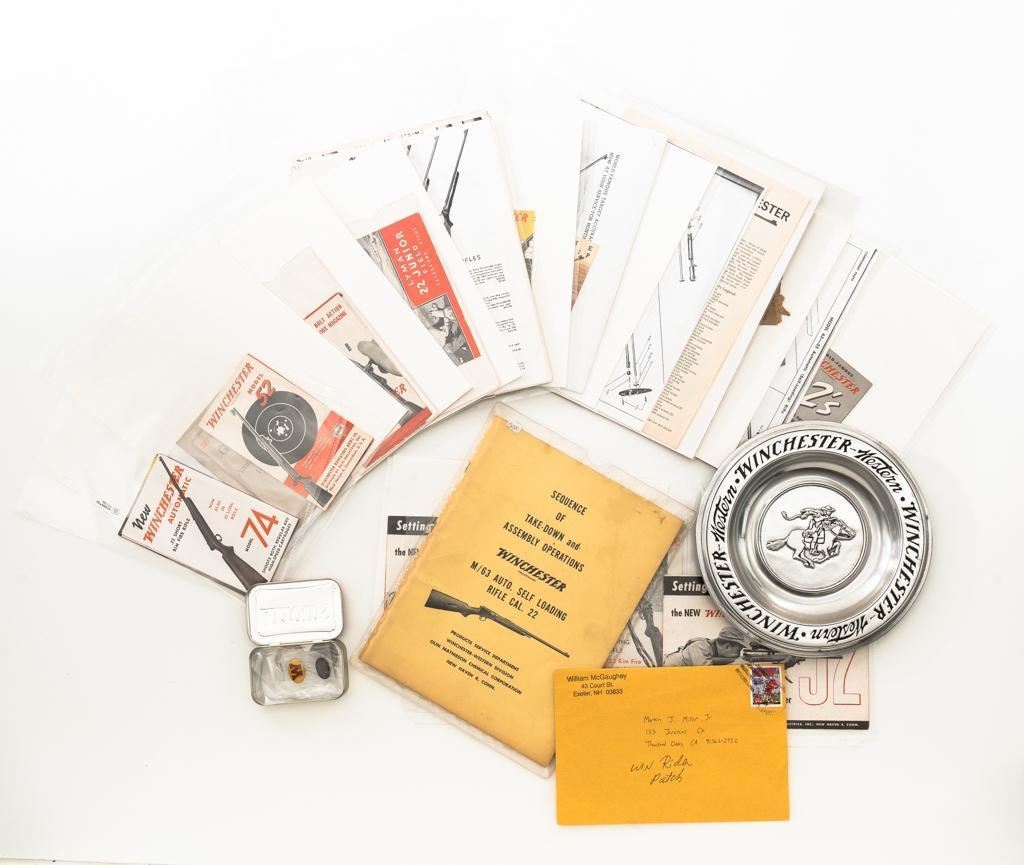 Winchester Collector Lot of Pamphlets, Literature, Pins, and Pewter Presentation Plate. The lot includes a large amount of Winchester literature including originals and copies of advertisers, articles, and magazine artwork relating to Winchester rimfire rifles, well preserved with plastic sleeves and backed with card stock. The lot further contains, a Model 63 field manual, 13+ original pamphlets for Models 52, 60A, 69A, and 74, among others. There is an original Lyman optics advert for Winchester. Additionally, an original Winchester "Rider" cloth patch in excellent condition, two (2) lapel pins, including a large red "W" against a yellow background, and brass Winchester/Western with "WP" proof. A Winchester-Western pewter presentation plate completes the lot. A fine collection for the Winchester rimfire enthusiast. Est. $300-$500/lot.