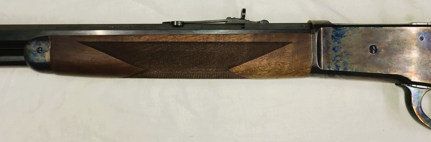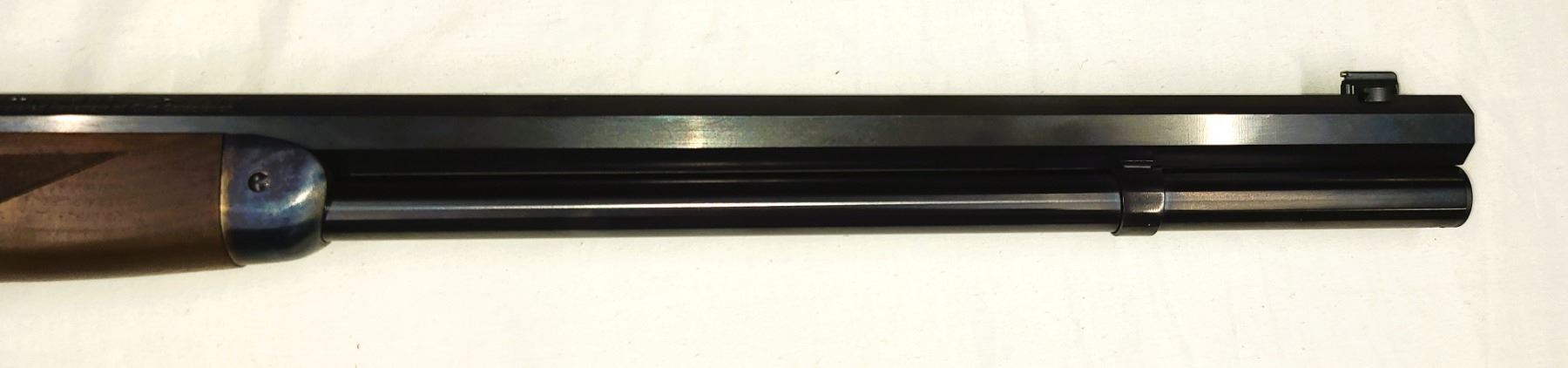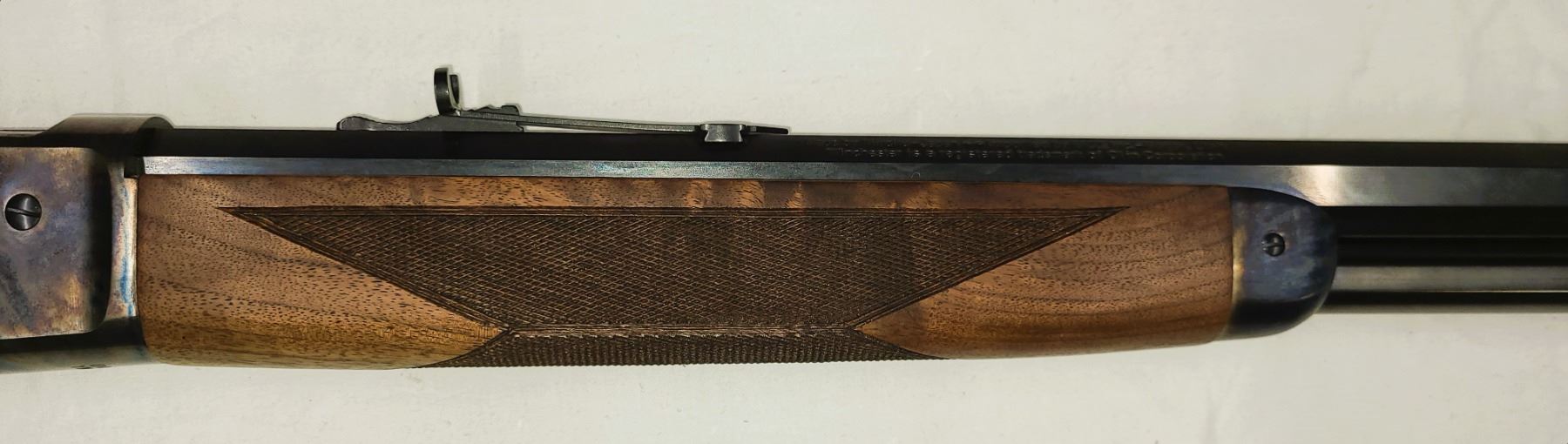 Color case hardened receiver, lever, forearm cap and crescent buttplate. 24 inch