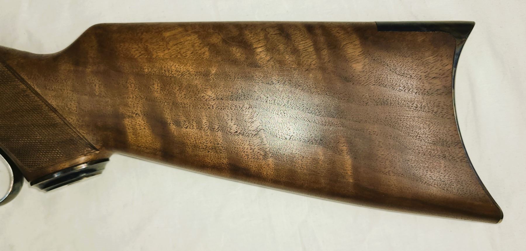 blued octagon barrel. High Grade III/IV satin finish checkered walnut curved grip