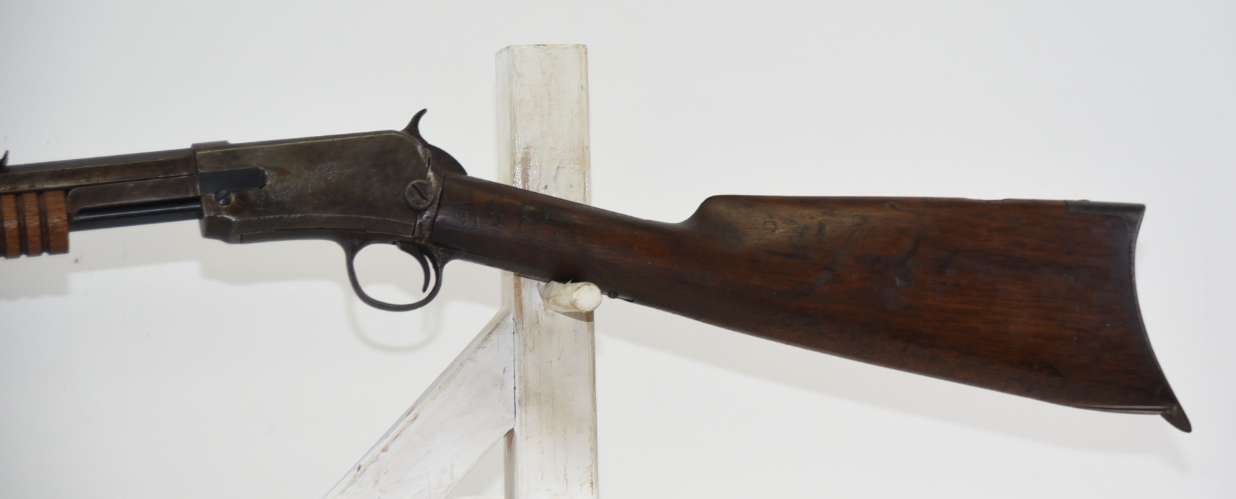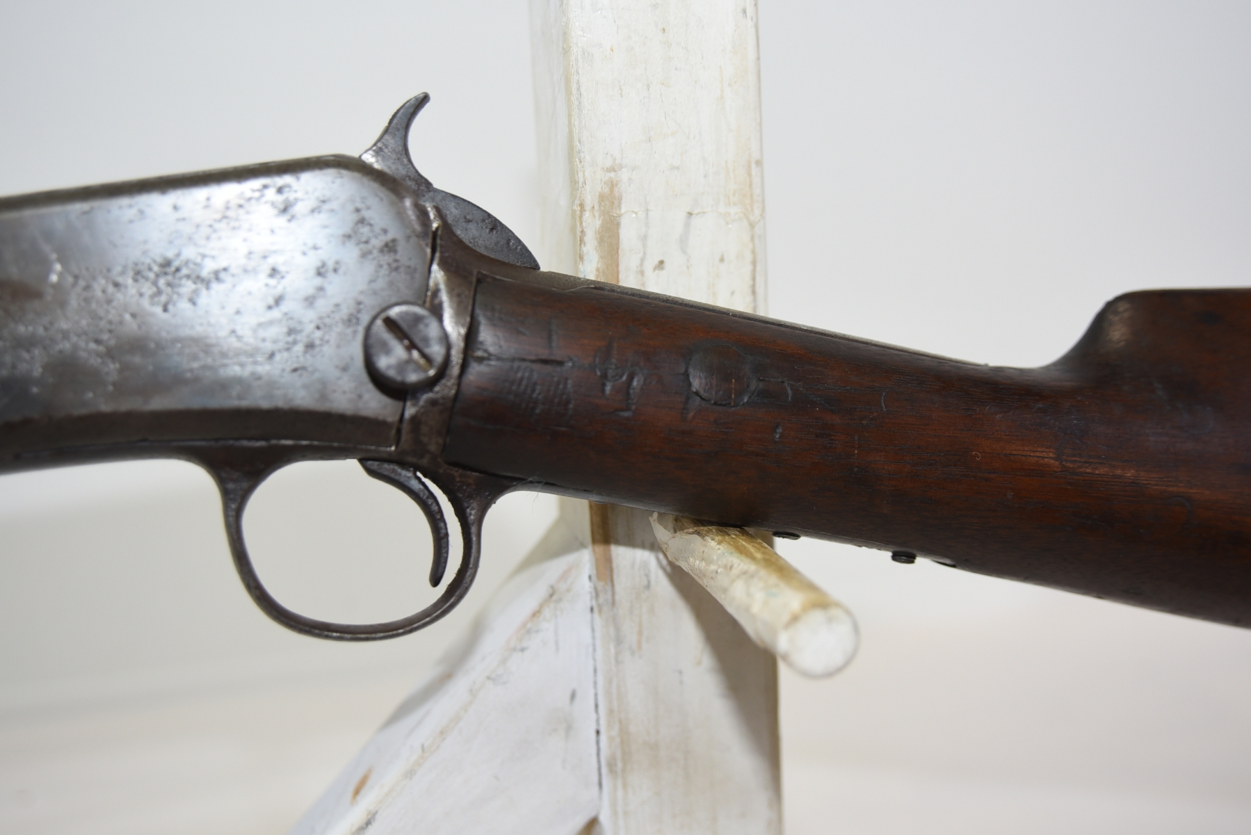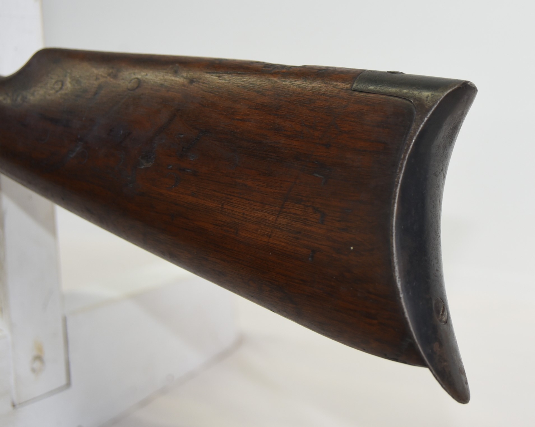 Wood stock shows scratches, scuffs, dents, piece missing at the heel; condition is less than fair for age.