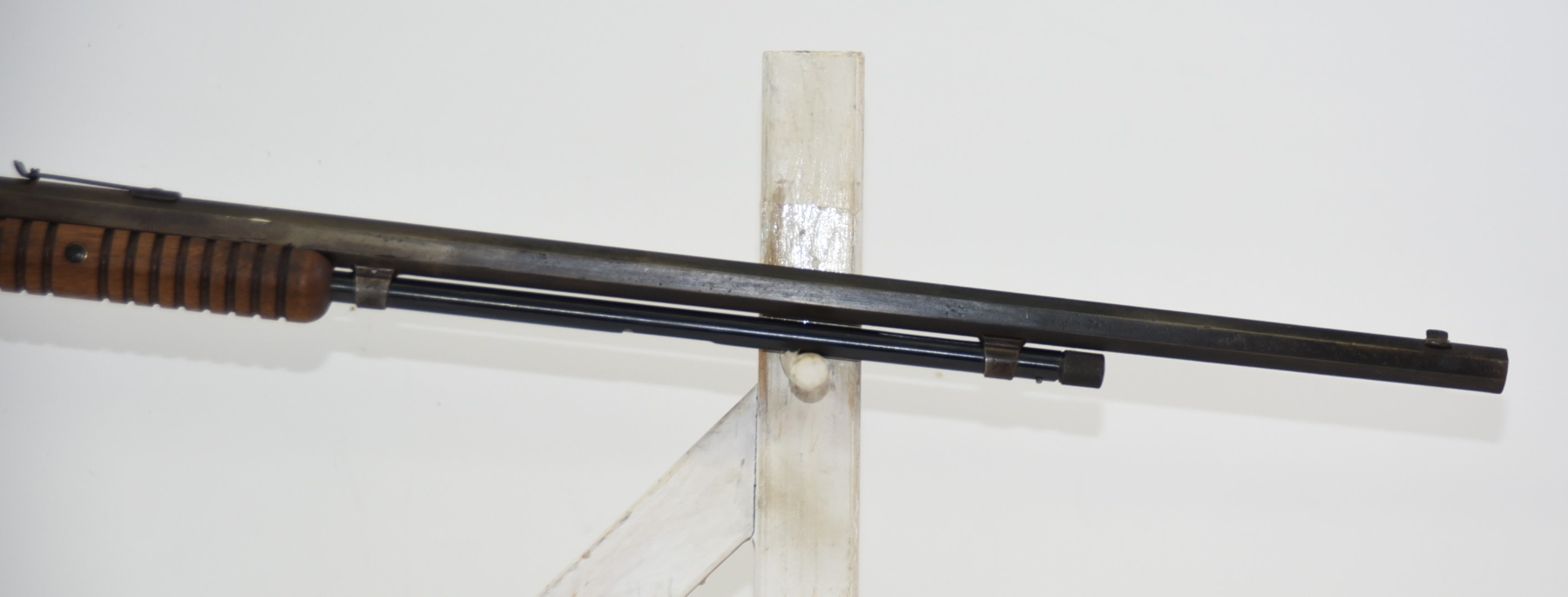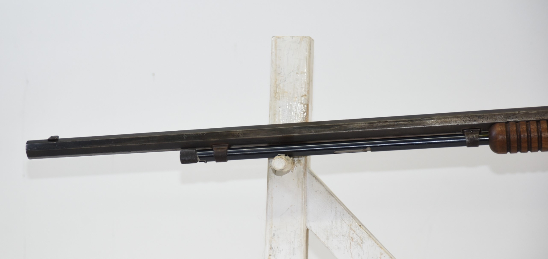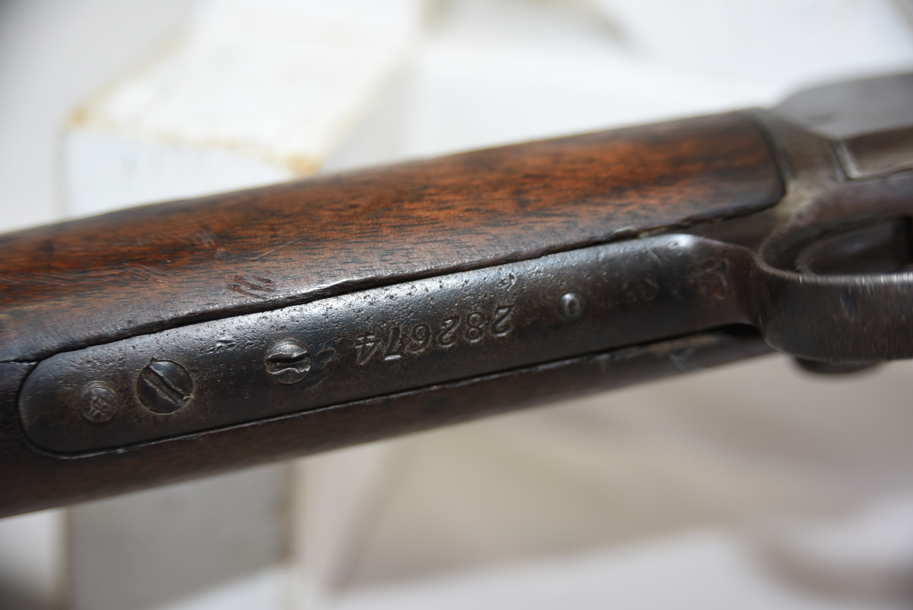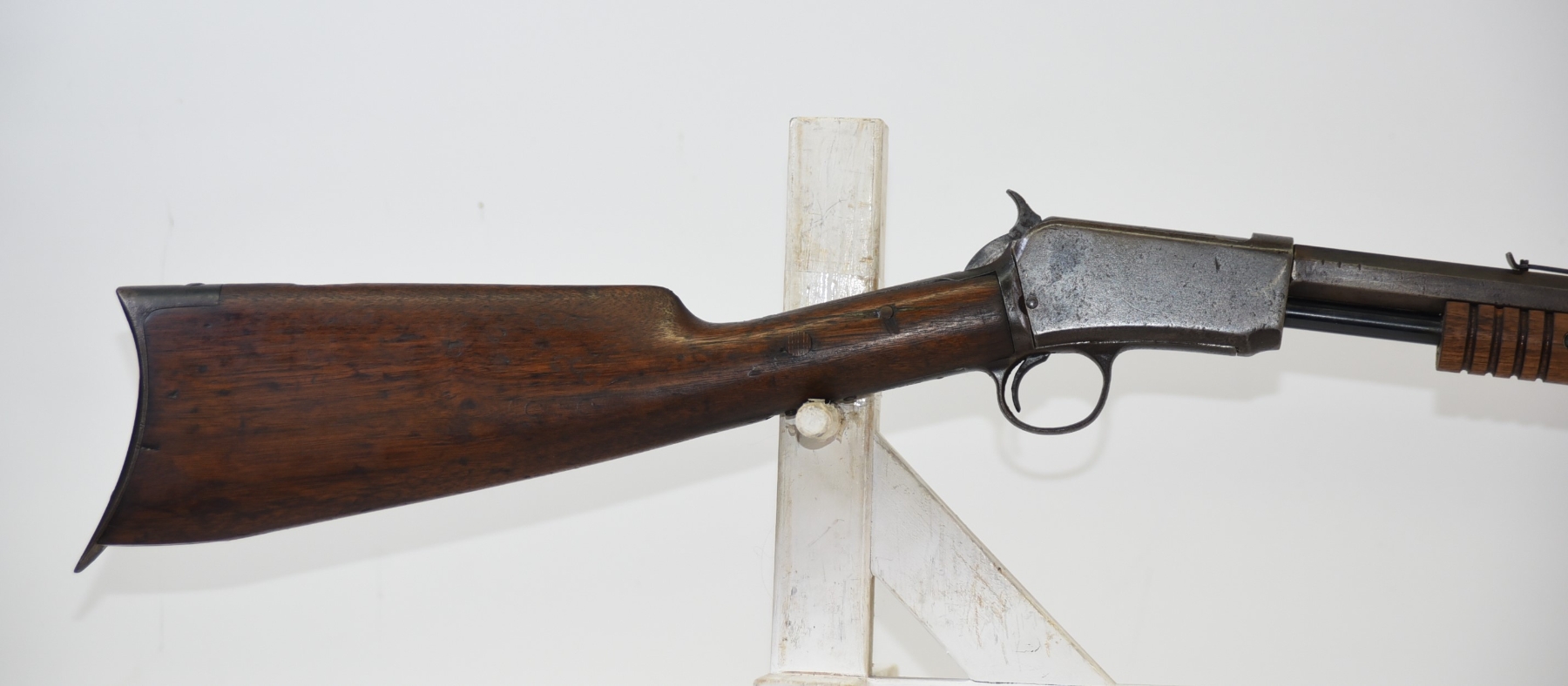 Wood stock shows scratches, scuffs, dents, piece missing at the heel; condition is less than fair for age.