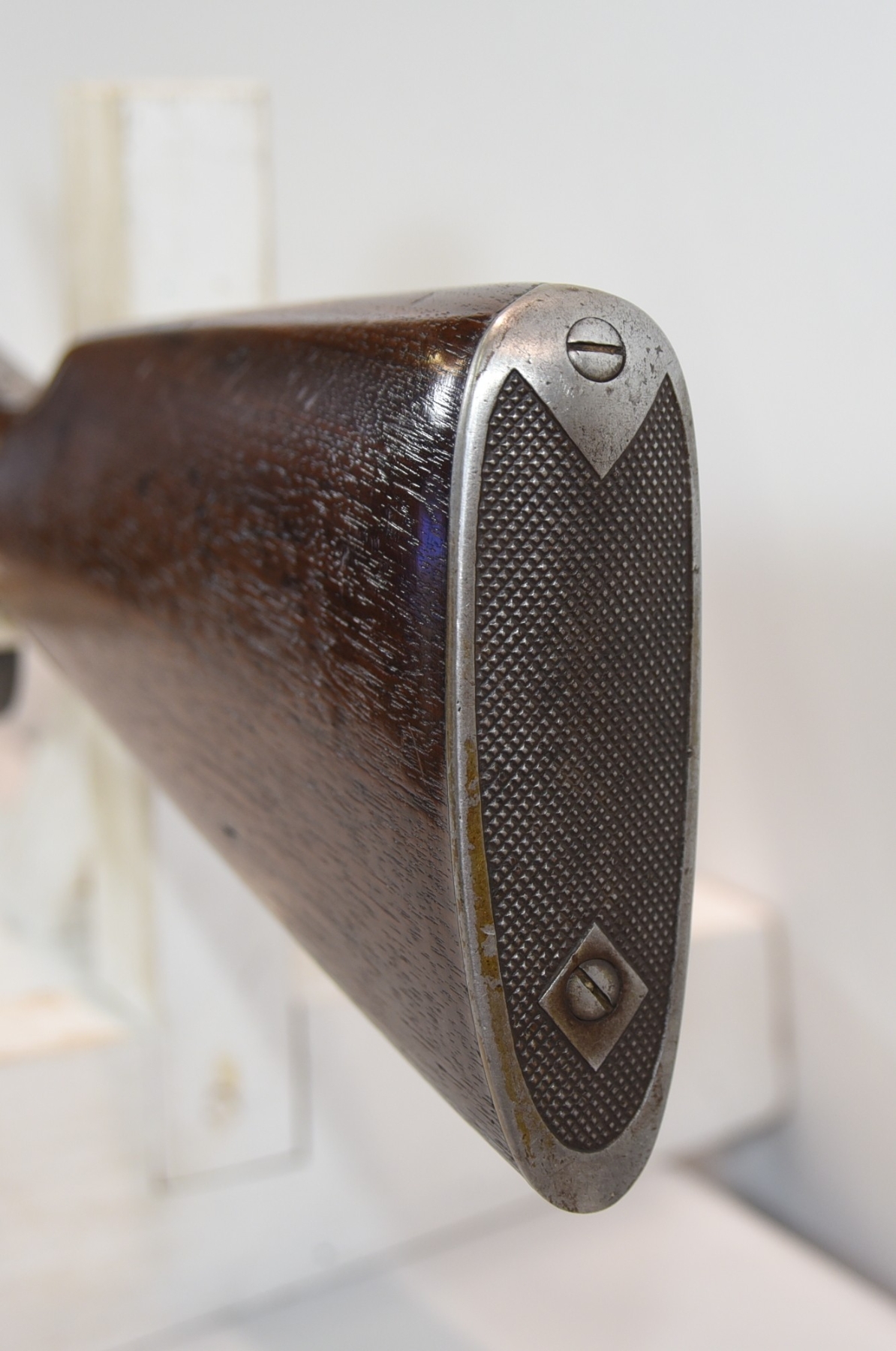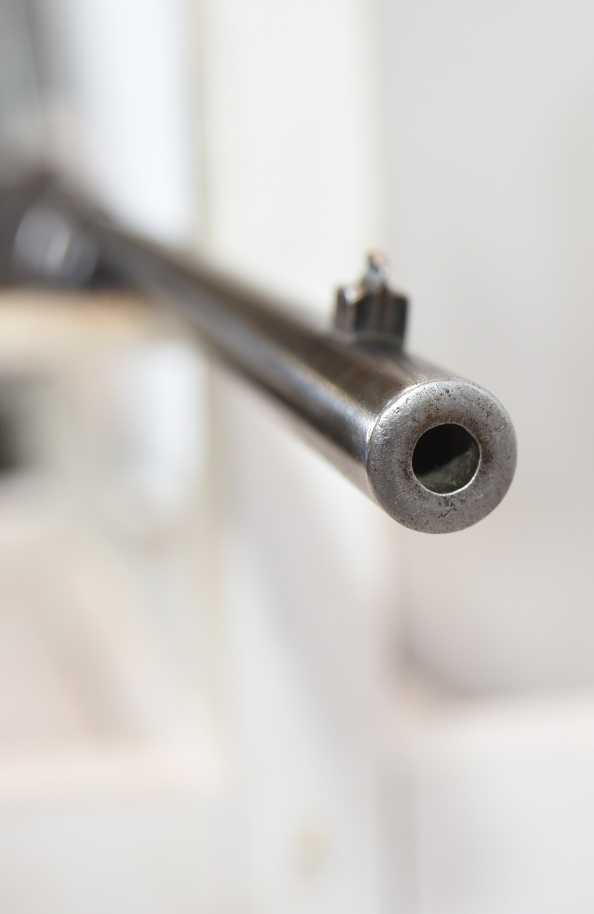 Bore is dark grey, shows a roughness to it, rifling is present. Condition is less than fair.