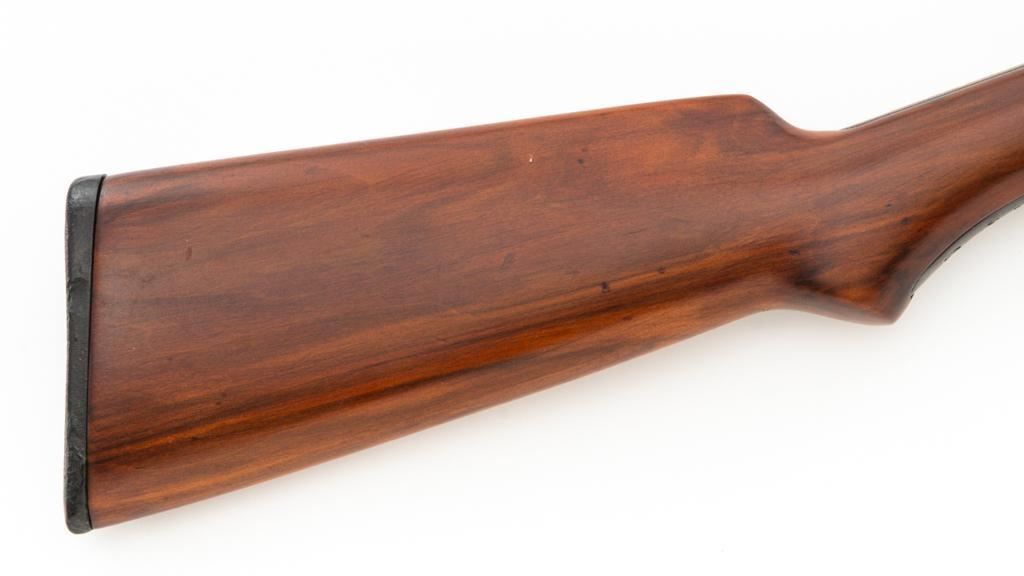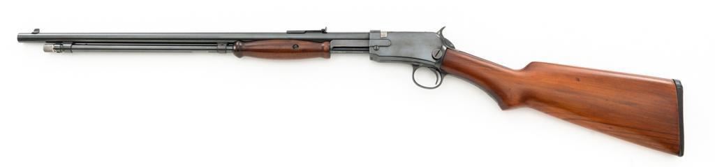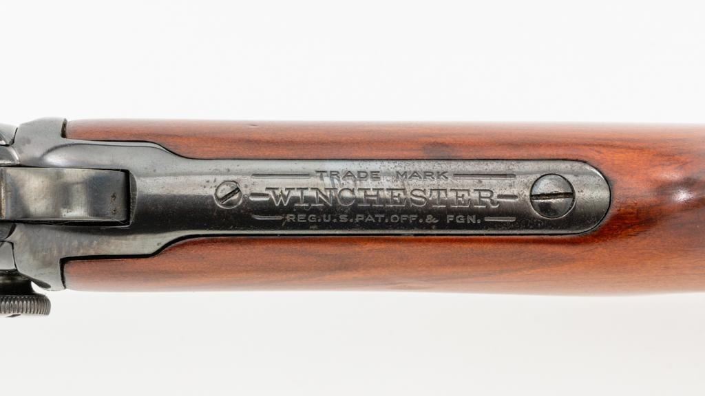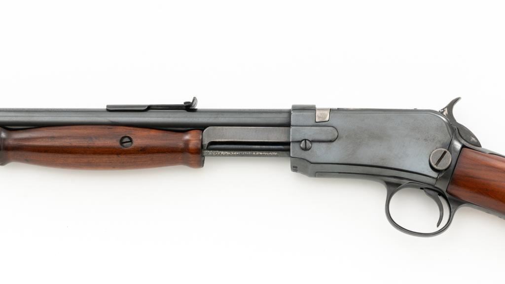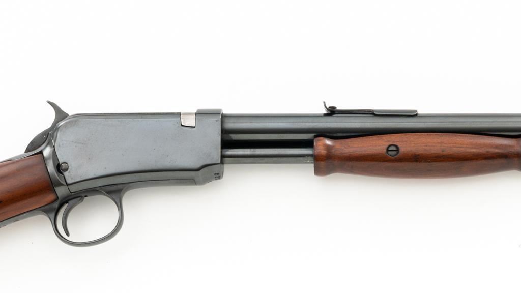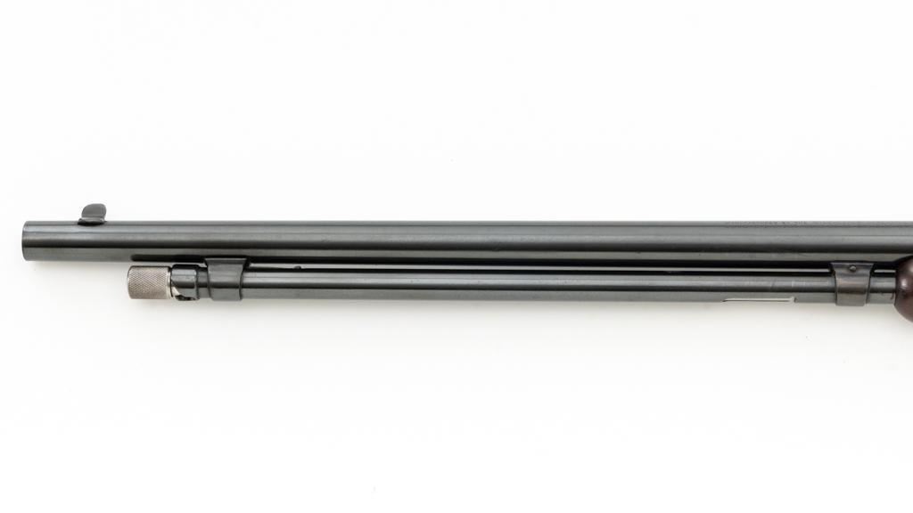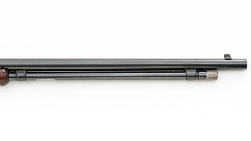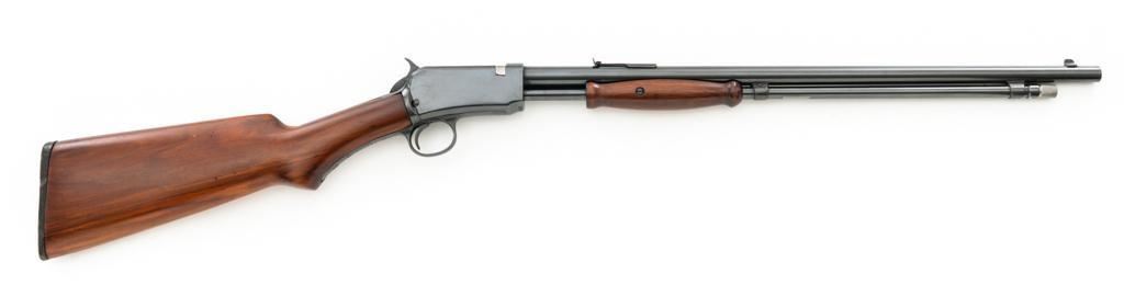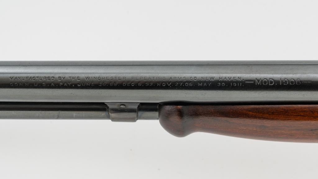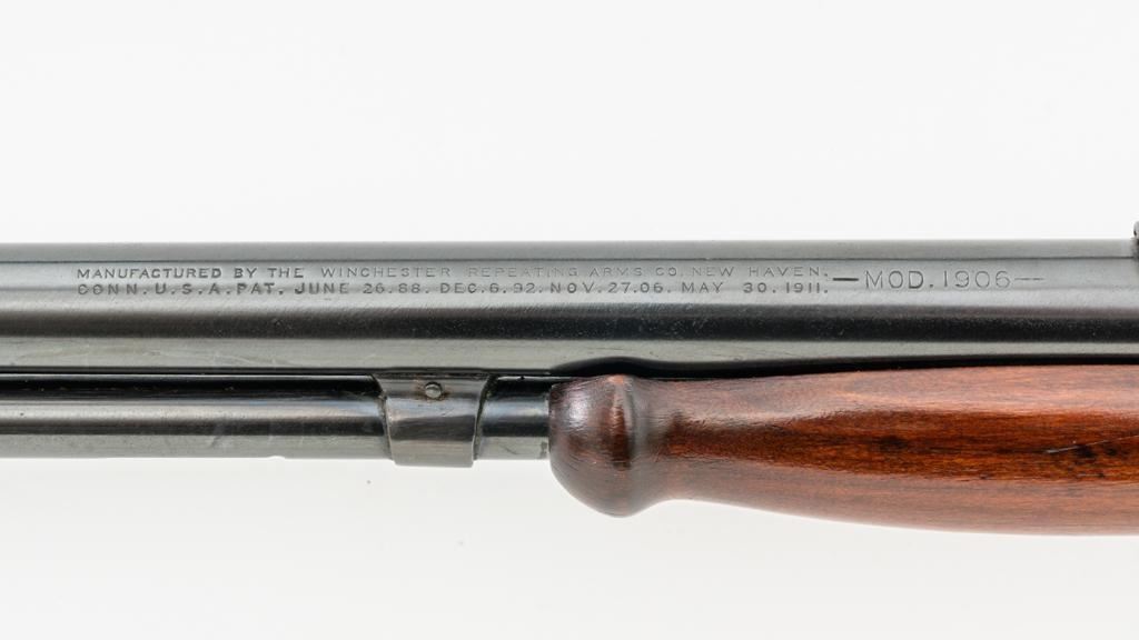 Winchester Model 1906 Expert Slide Action Rifle, #537368, .22 S-L-LR cal., 20" barrel, blue finish, smooth walnut pistol grip stock and distinctively shaped forend, dovetailed blade front and standard "U"-notch rear sight. Factory markings are legible, with Winchester "WP" proofs on the receiver and barrel. Mfgd 1918. Rifle is in near excellent overall condition as refinished, retaining approx. 97%-98% of an old quality reblued finish, with minor marks, and the bolt having been cleaned to white. Stock is in near excellent condition as refinished, showing aggressive sanding, leaving metal parts and the buttplate proud. Action functions smoothly. Bore is fair with moderate erosion and visible rifling. Est.: $300-$500. (C&R)
