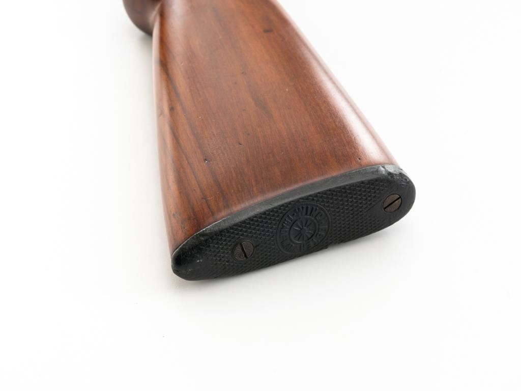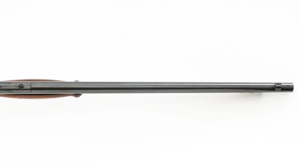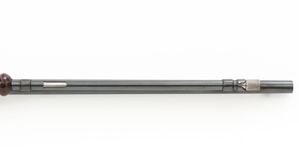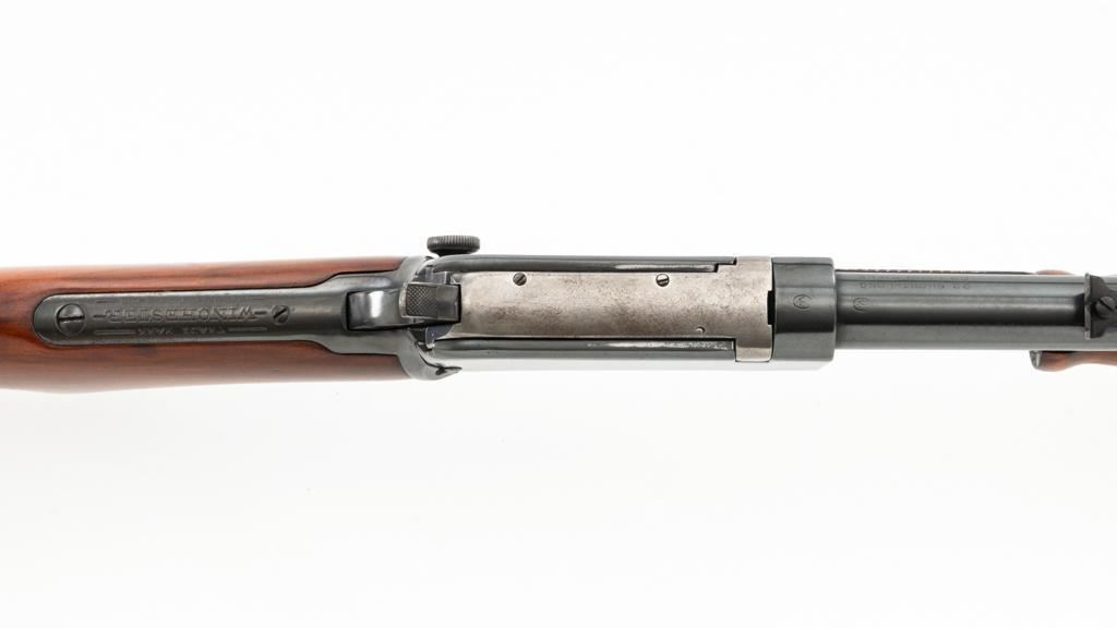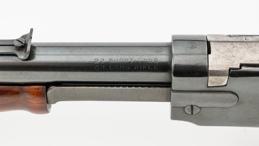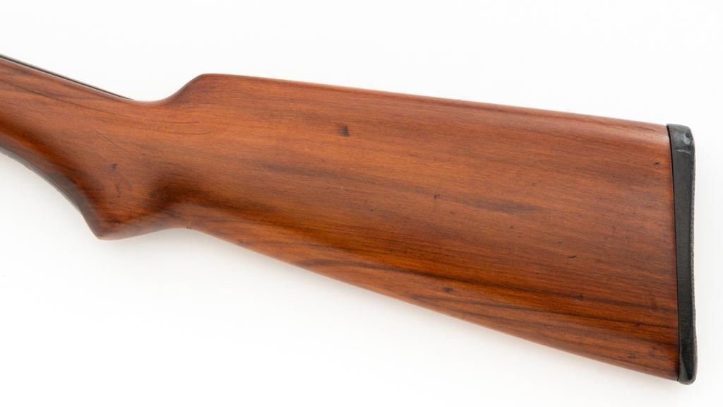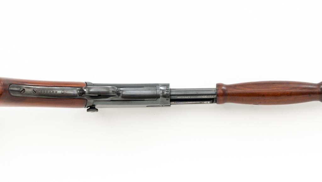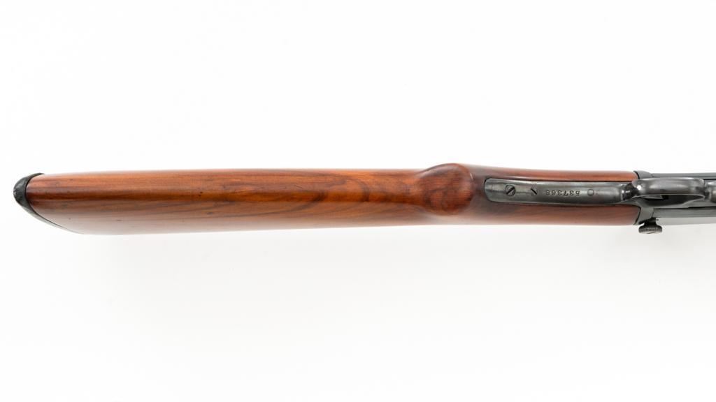 Winchester Model 1906 Expert Slide Action Rifle, #537368, .22 S-L-LR cal., 20" barrel, blue finish, smooth walnut pistol grip stock and distinctively shaped forend, dovetailed blade front and standard "U"-notch rear sight. Factory markings are legible, with Winchester "WP" proofs on the receiver and barrel. Mfgd 1918. Rifle is in near excellent overall condition as refinished, retaining approx. 97%-98% of an old quality reblued finish, with minor marks, and the bolt having been cleaned to white. Stock is in near excellent condition as refinished, showing aggressive sanding, leaving metal parts and the buttplate proud. Action functions smoothly. Bore is fair with moderate erosion and visible rifling. Est.: $300-$500. (C&R)