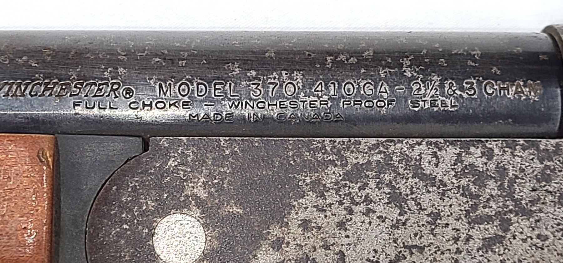 Barrel is marked WINCHESTER MODEL 370 410 GA 2 1/2 & 3 CHAM. FULL CHOKE
