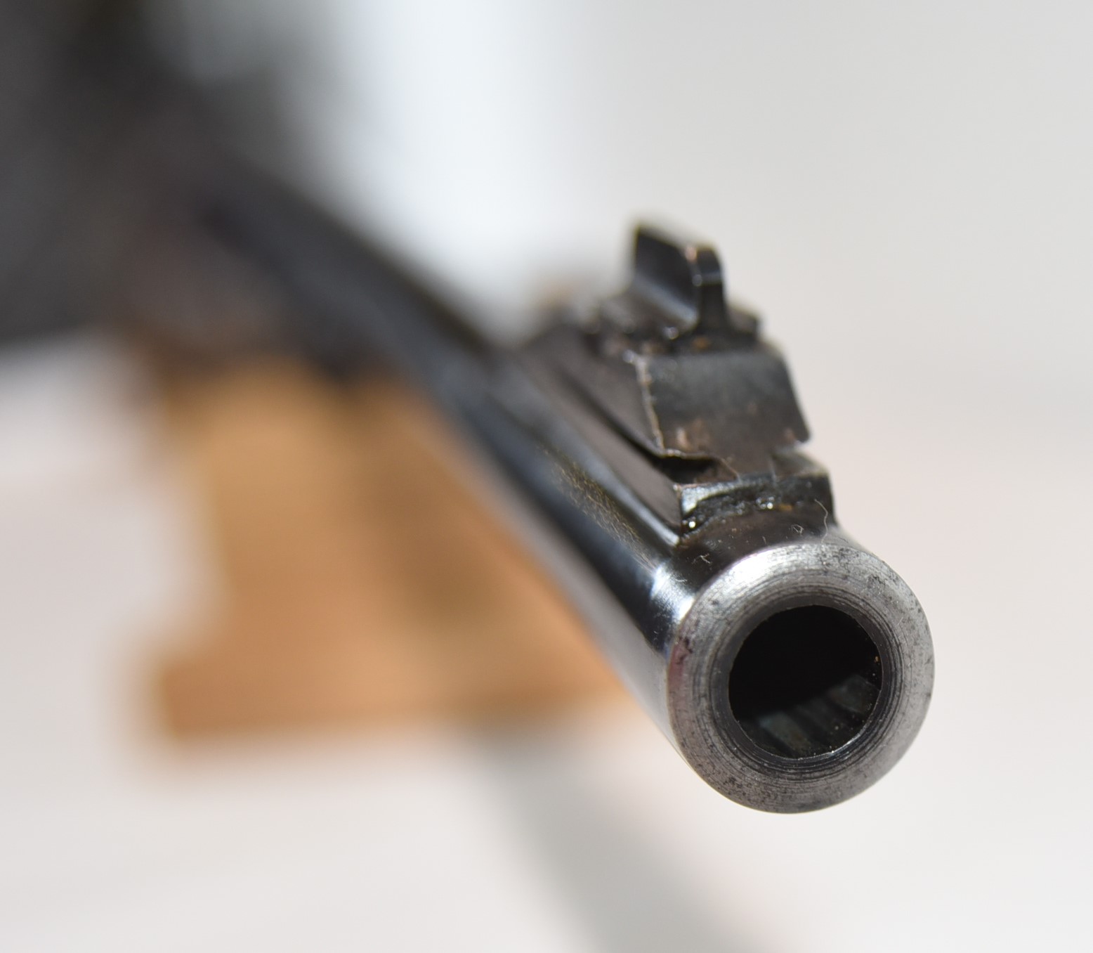 Metal finish shows scratches, patina, scuffs, rust on receiver with very fine spot of pits, missing front sight hood; condition is good.