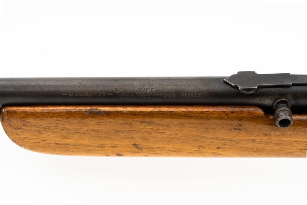 Winchester Model 77 Semi-Automatic Rifle, #3766, .22 LR cal., 22" round barrel, blue finish, smooth one-piece pistol grip hardwood stock, dovetailed blade front sight missing the silver bead, standard elevator rear sight, factory grooved receiver, and black nylon trigger guard. Rifle is in good condition, factory blue shows general thinning and toning, with clear factory lettering. Stock is serviceable and has had an additional coat of lacquer applied over scattered dents, small gouges, and a few small chips. Finish on the right side near the pistol grip appears to have had something make contact during the drying period, causing a fine checkering type pattern. Action functions smoothly, bore is good with crisp rifling. Est.: $150-$250. (C&R)