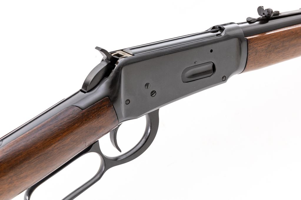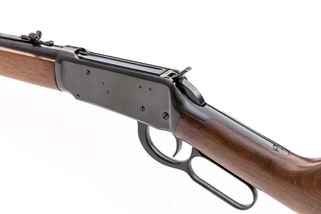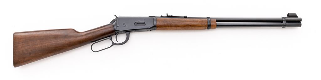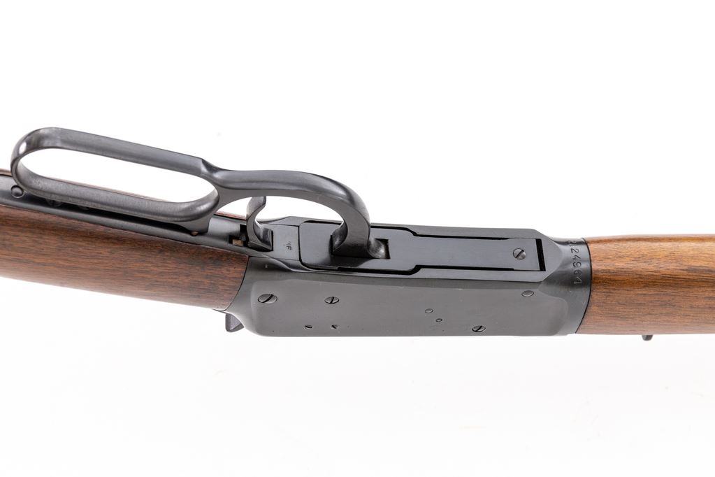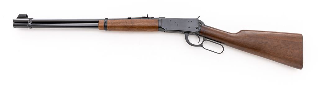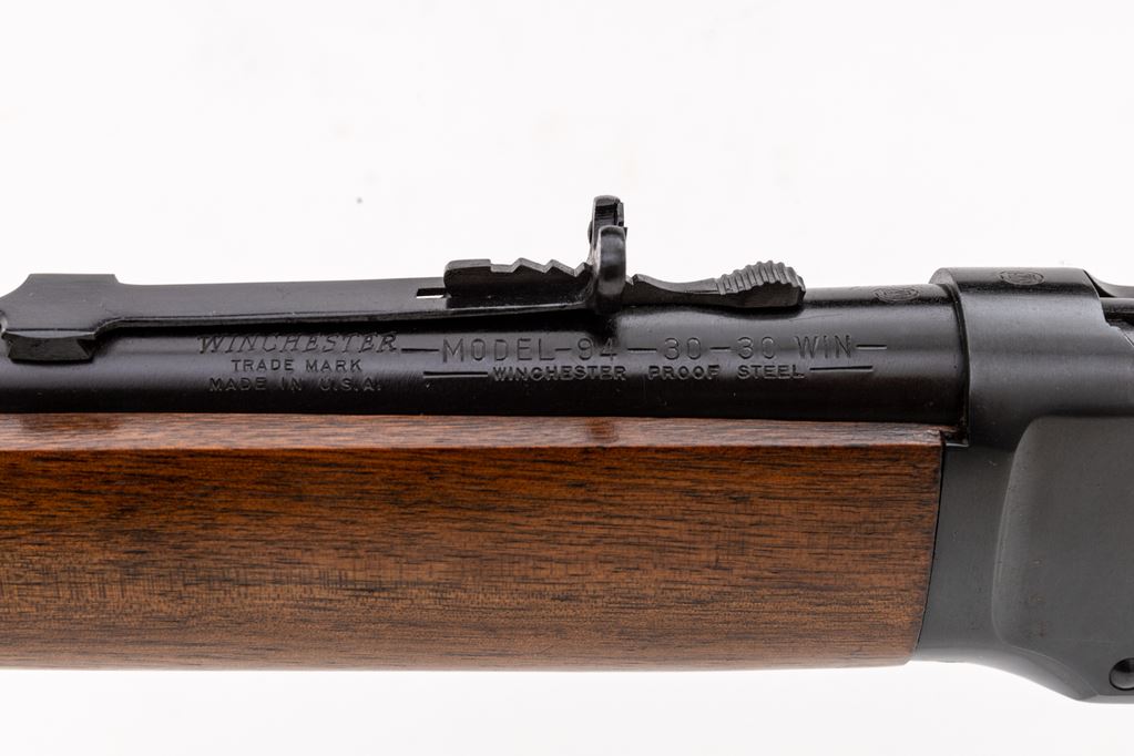 Winchester Model 94 Lever Action Carbine, #2124964, .30 W.C.F. (.30-30) cal., 20" round barrel with hooded/ramped bead-blade front and adjustable buckhorn rear sights, marked "Winchester/Trade Mark/Made in U.S.A. — Model-94 – 30-30 Win./Winchester/Proof Steel" at left; receiver has right loading, top ejection, bottom loop operating lever; oil-stained walnut forend has a single band, matching buttstock with checkered flat buttplate. Mfg'd 1955. Condition is excellent retaining approx. 99% blue. Stocks are sound and smooth with all original finish. Edges and markings are sharp, action is crisp, bore is brilliant with sharp rifling. Appears unfired. Est.: $800-$1,200. (C&R)