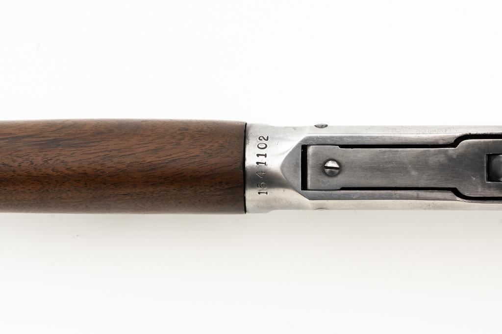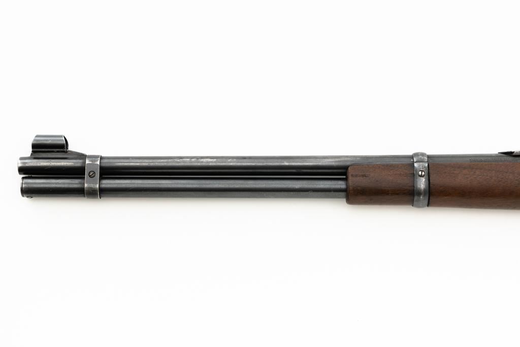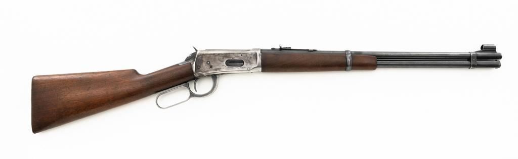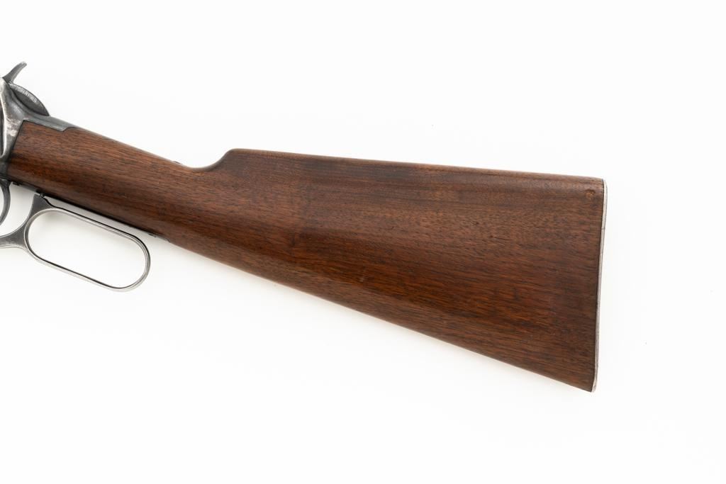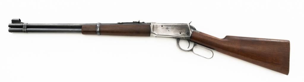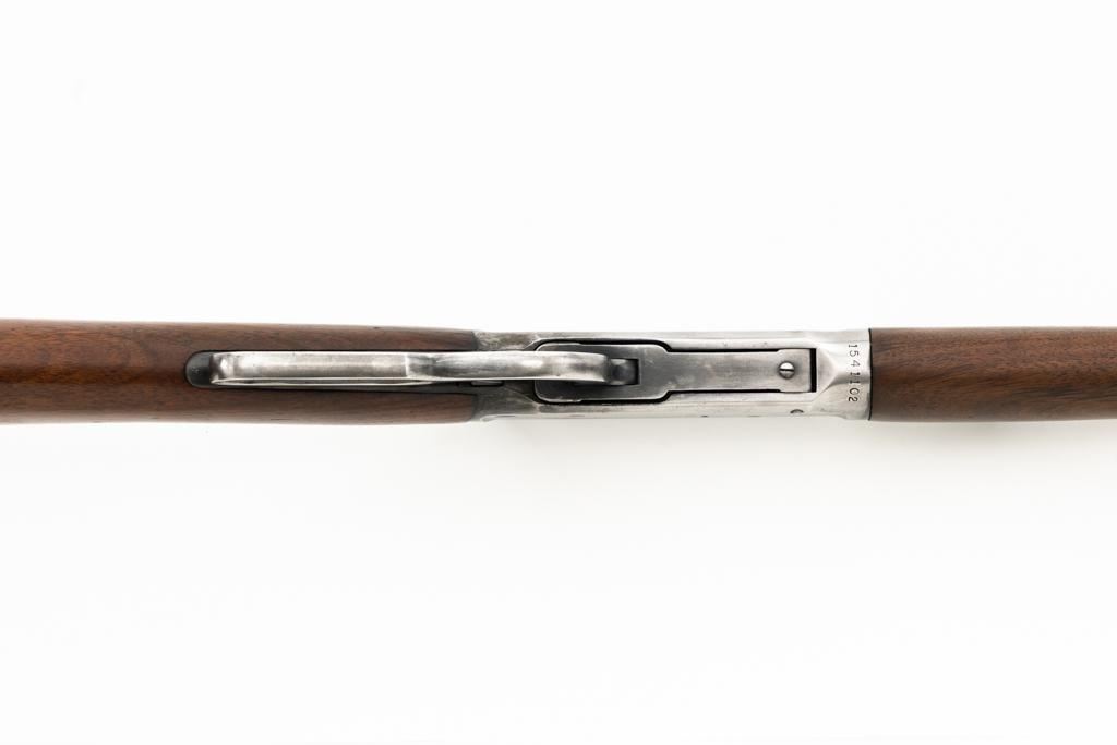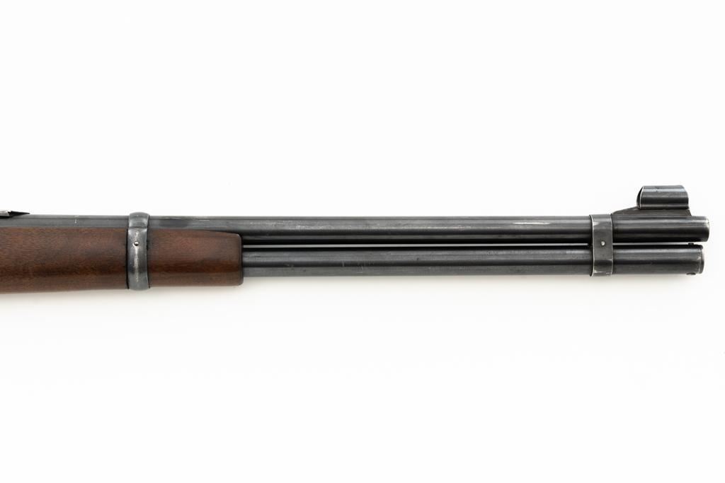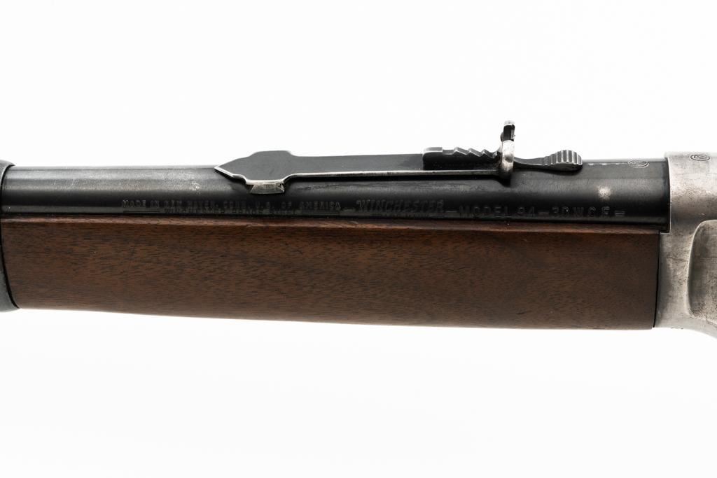 Winchester Model 94 Lever Action Carbine, #1541102, 30 WCF cal., 20" barrel, blued finish, straight grip walnut stock and handguard, ramped beaded blade front sight, and adjustable elevator rear sight with "U"-notched groove. Mfgd 1948. Condition overall is very good. Receiver is mostly worn bright with the remaining finish to the rear, showing light scratches to the left side. Lever is also worn bright with finish remaining mostly to the sides and top. Barrel and magazine retain approx. 70% blue, with general scratches and handling marks. Wood with scattered moderate dents and scratches. Action operates smoothly. Bore is bright with very good rifling. Est.: $500-$750. (C&R)