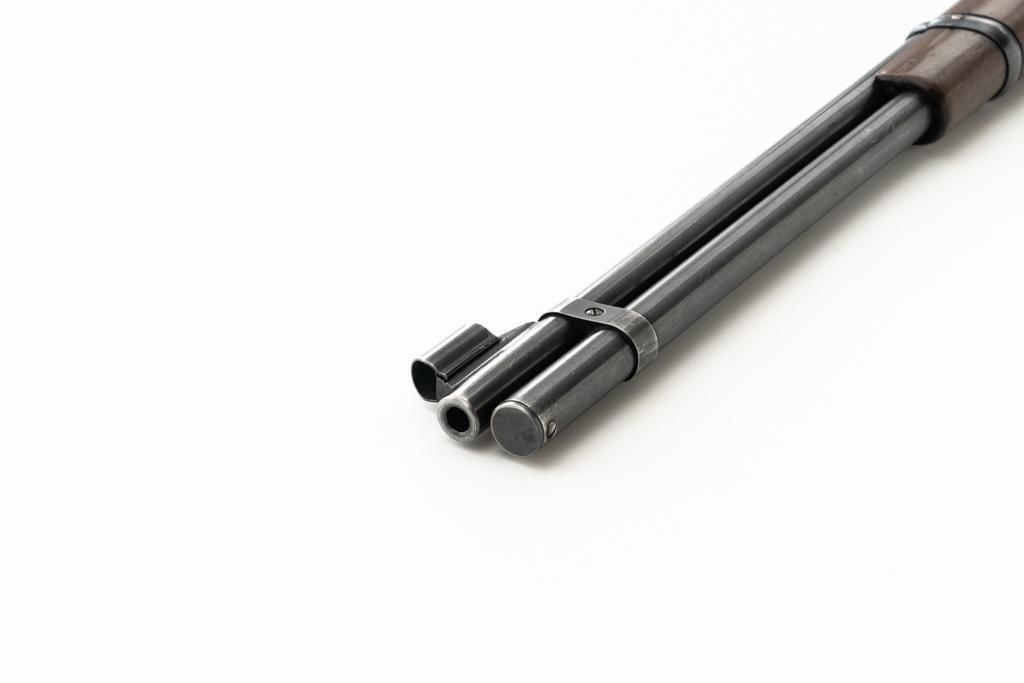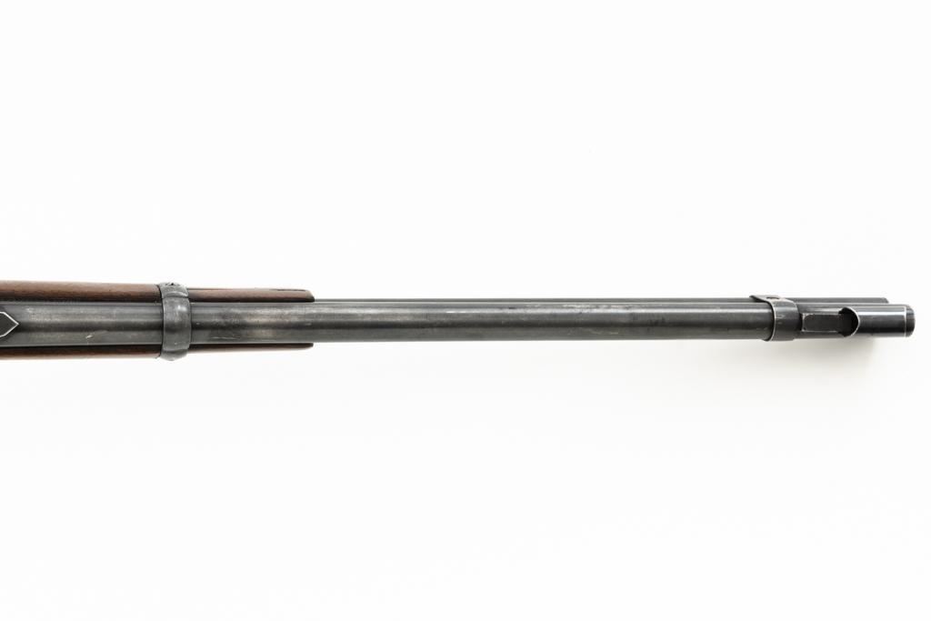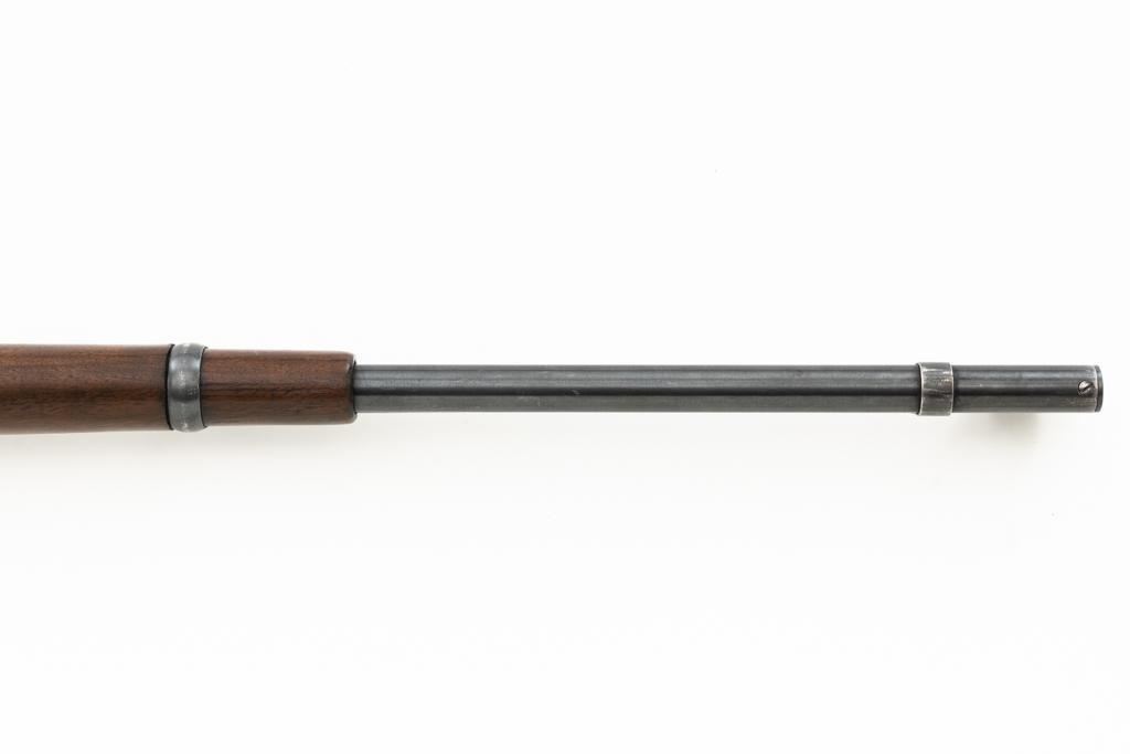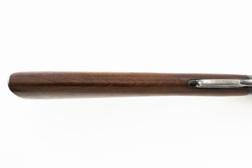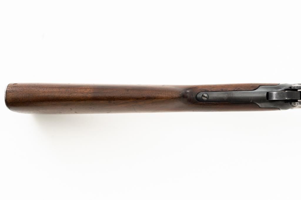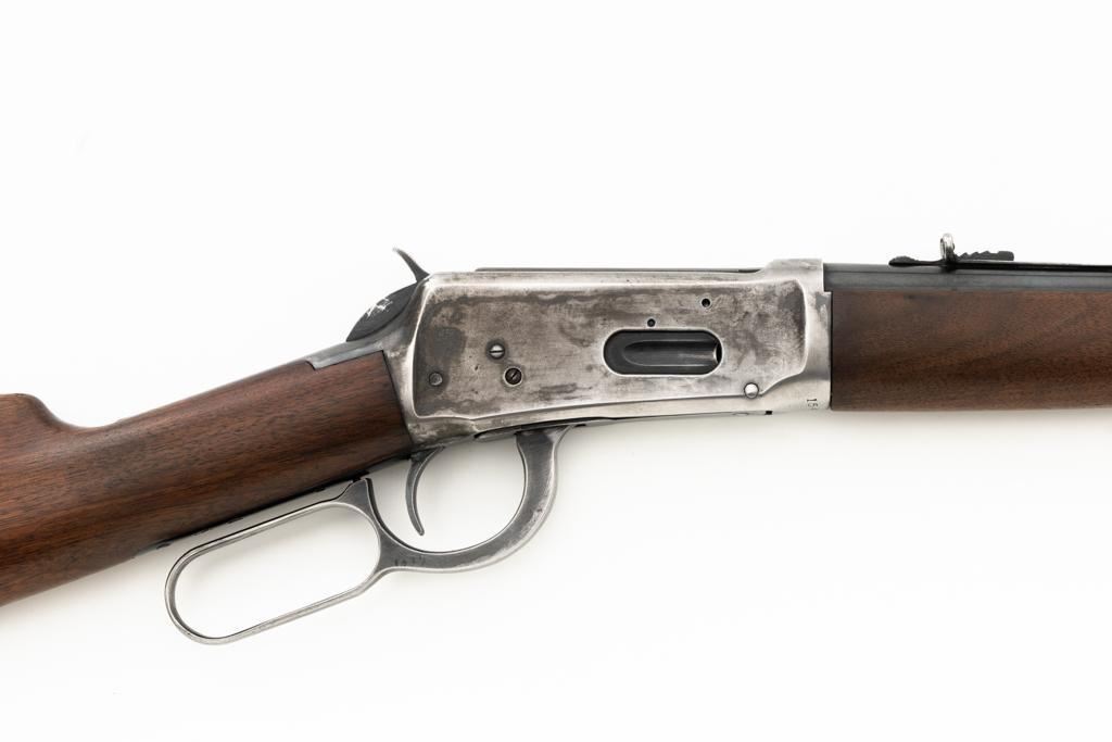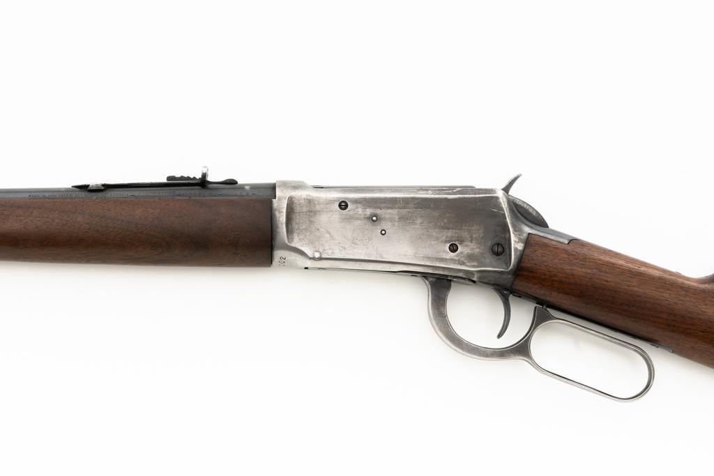 Winchester Model 94 Lever Action Carbine, #1541102, 30 WCF cal., 20" barrel, blued finish, straight grip walnut stock and handguard, ramped beaded blade front sight, and adjustable elevator rear sight with "U"-notched groove. Mfgd 1948. Condition overall is very good. Receiver is mostly worn bright with the remaining finish to the rear, showing light scratches to the left side. Lever is also worn bright with finish remaining mostly to the sides and top. Barrel and magazine retain approx. 70% blue, with general scratches and handling marks. Wood with scattered moderate dents and scratches. Action operates smoothly. Bore is bright with very good rifling. Est.: $500-$750. (C&R)