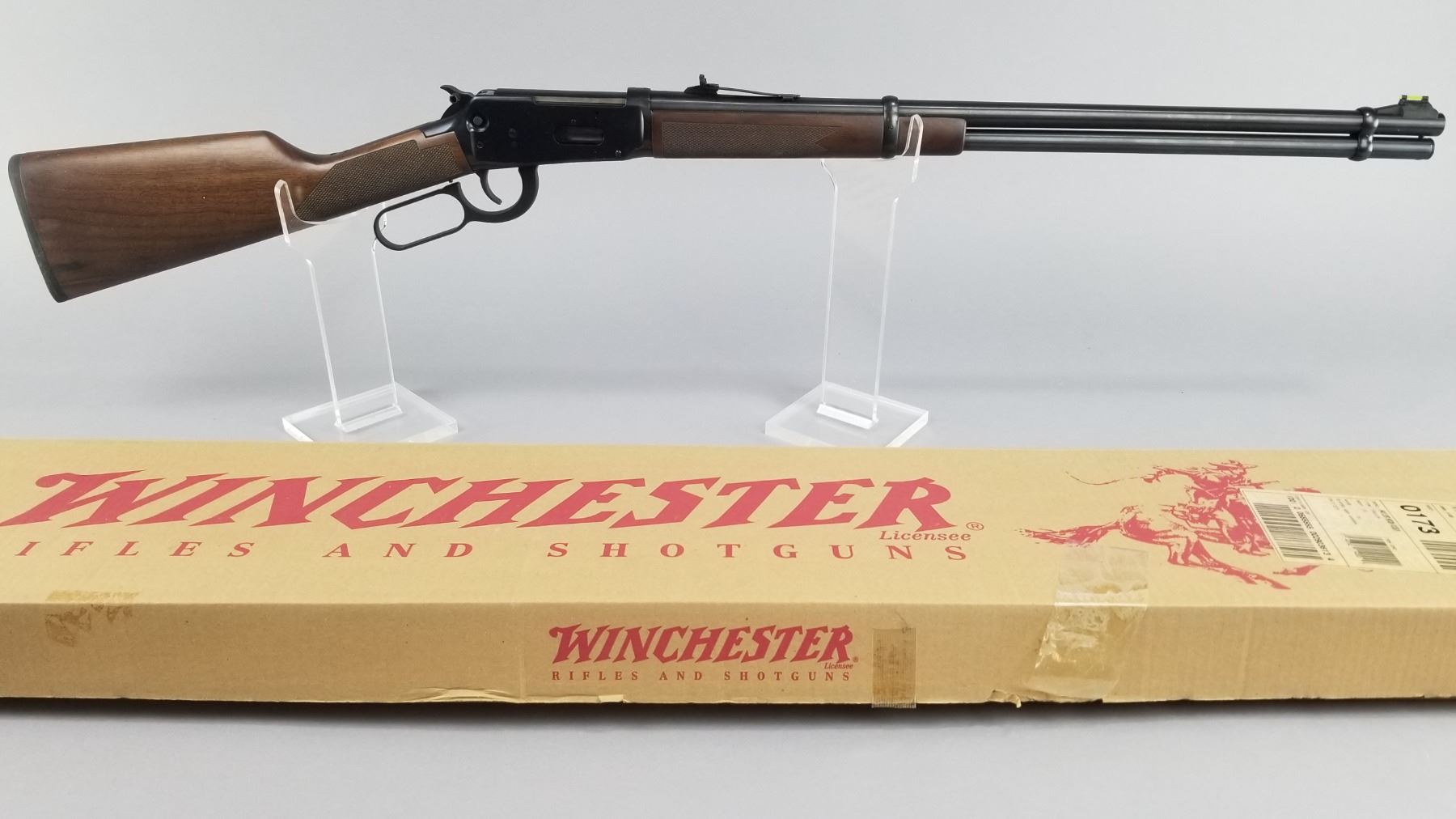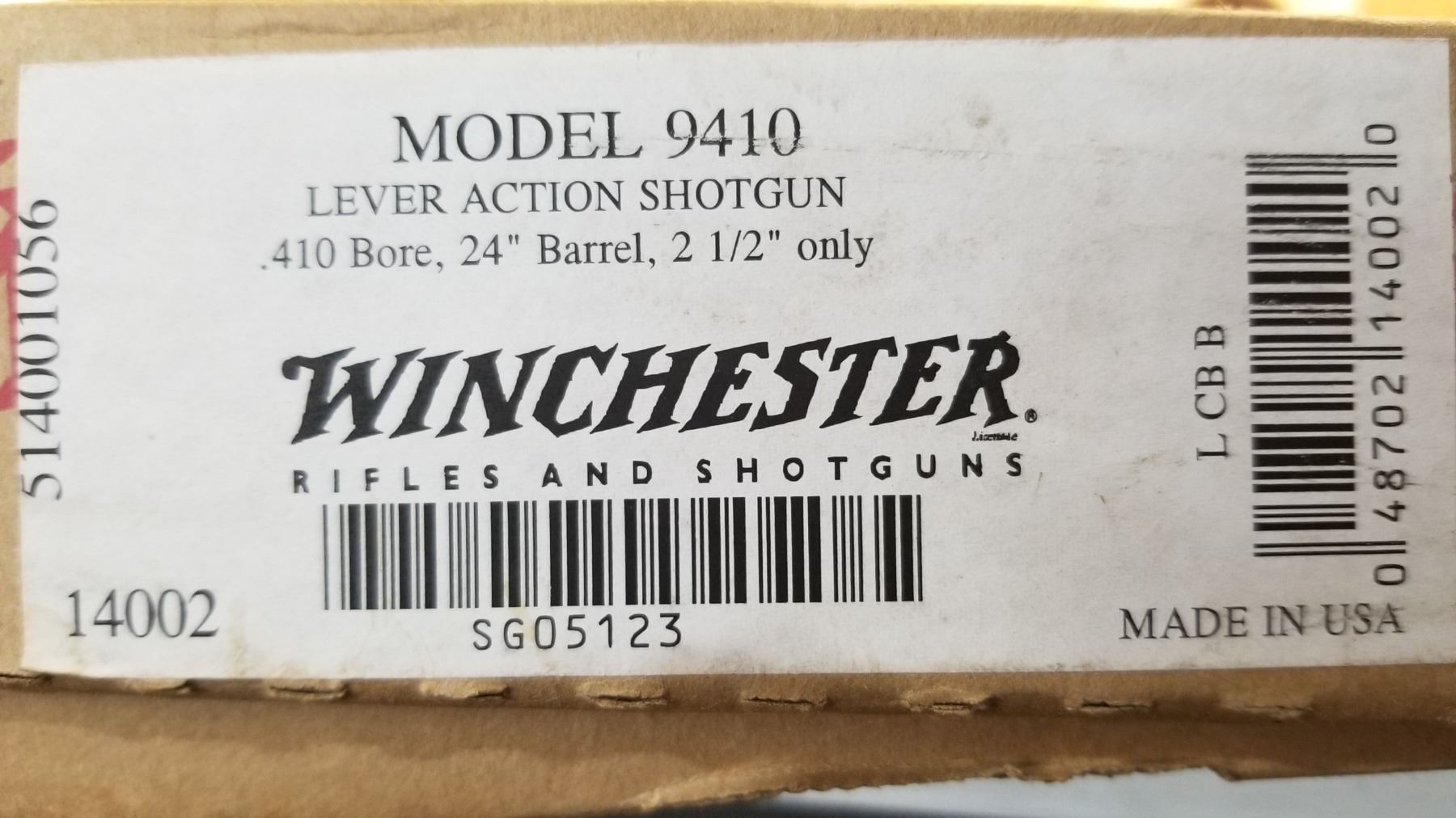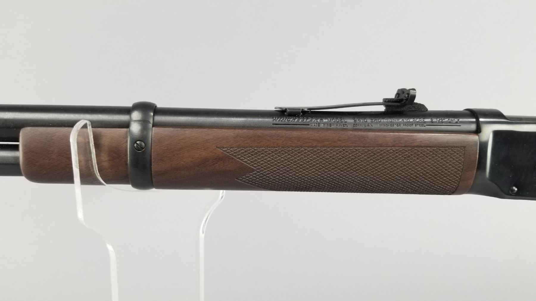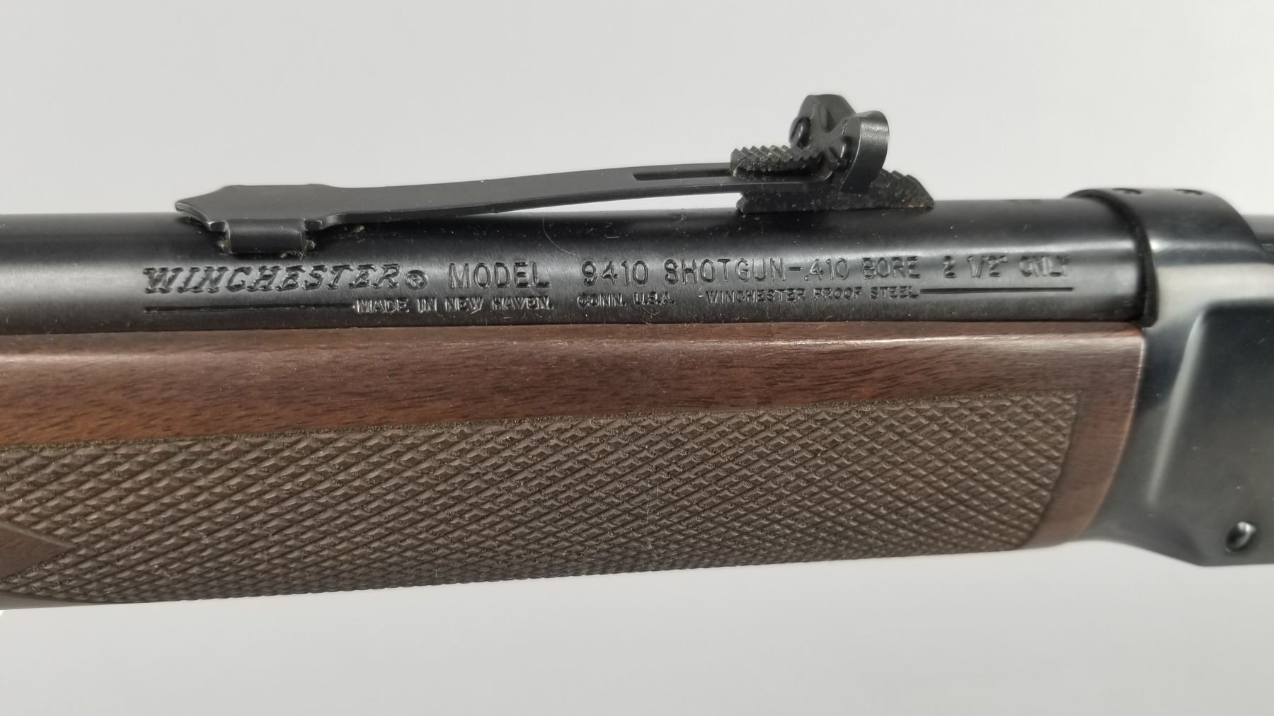 Blued barrel and receiver with black walnut checkered stock and forearm. High vis ramp style front sight with adjustable ramp style rear sight. Lever action and chambered only for 2.5" shells. Includes original Winchester box, paperwork, and hang tag. Condition: New in box. Maker: Winchester Model: 9410 Caliber/Gauge: .410 Chamber: 2.5" Only SN: SG05123 Barrel: 24" Type: Shotgun NICS Required?: YES