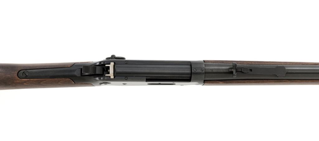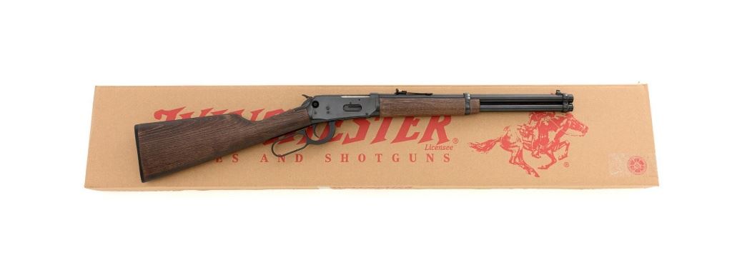 Winchester Model 94AE Ranger Compact Lever Action Carbine, #6481619, .357 Mag. cal., 16" barrel, with blue finish. Smooth satin oil finished walnut forend and straight grip stock, ends with a checkered plastic Winchester shotgun style buttplate, providing a 13.5" LOP. Carbine also features a factory dovetailed blade front sight, standard elevator rear sight with "U"-notched groove, cross bolt safety, saddle ring, factory drilled and tapped receiver. Factory markings are clear, with a sharp Winchester "WP" proof on top of the barrel. Includes factory cardboard box with matching end label, original hang tag, hammer extensions, cable lock, instruction manual, warranty card, and associated packaging materials. Carbine is in excellent condition, showing only a few light handling and storage marks. Action is crisp. Bore is mirror bright with excellent rifling. Est.: $800-$1,100. (Modern)