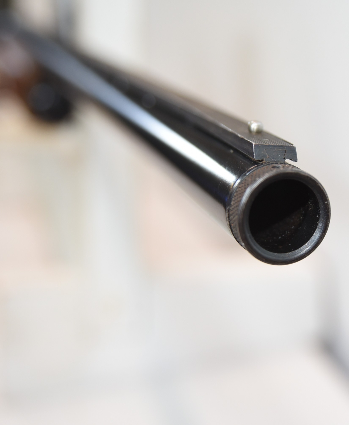 Wood stock shows a piece missing at the heel of stock with a piece missing from the butt plate, there are scratches, scuffs, few light dents; condition is fair.