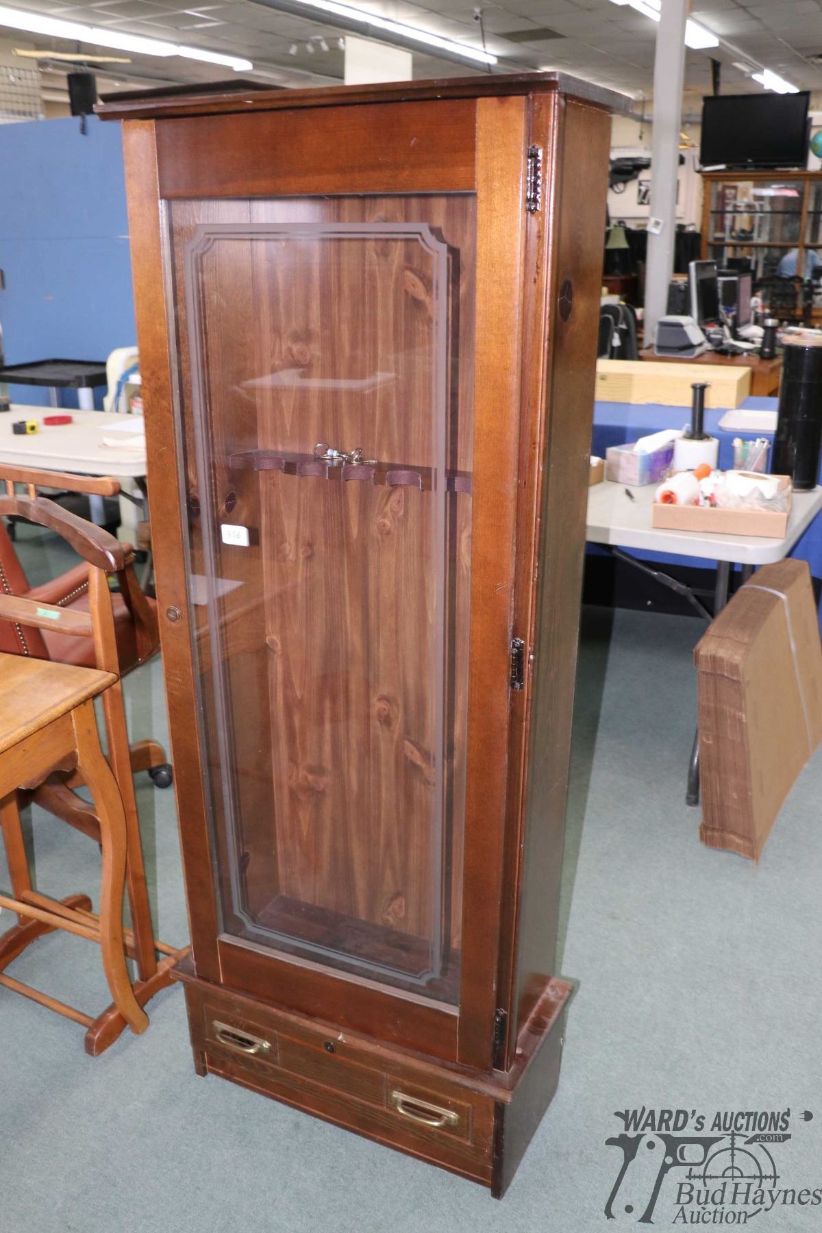 Wood and glass locking gun display cab with lower locking shelf. Has keys