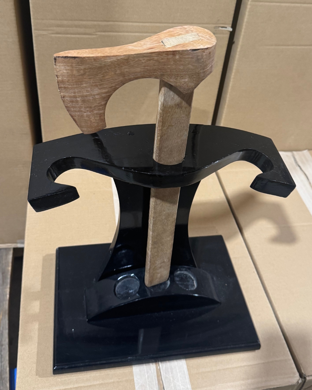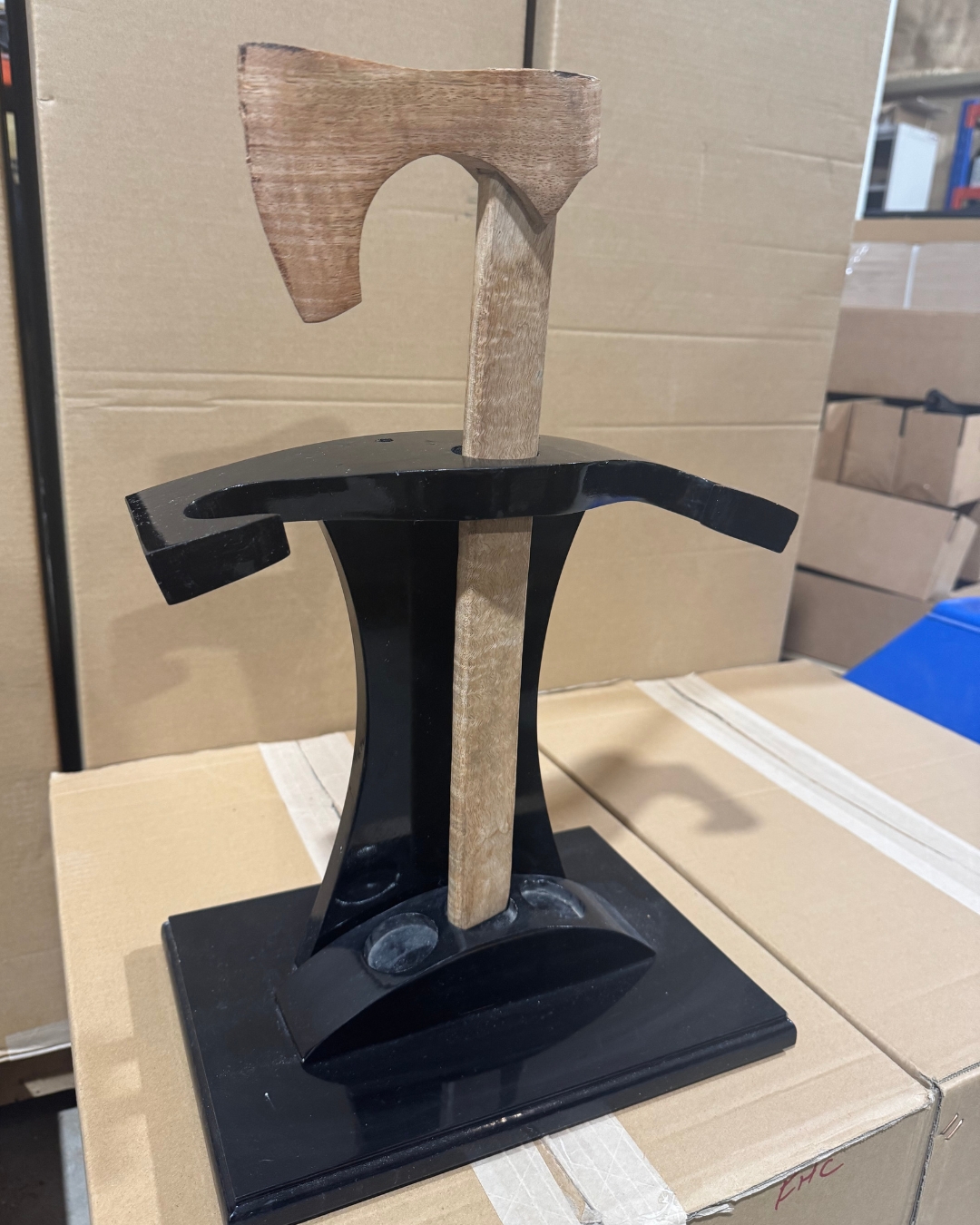 Axe stand, holds 3 axes vertically, made of wood, some wear and tear is seen, sold as is.