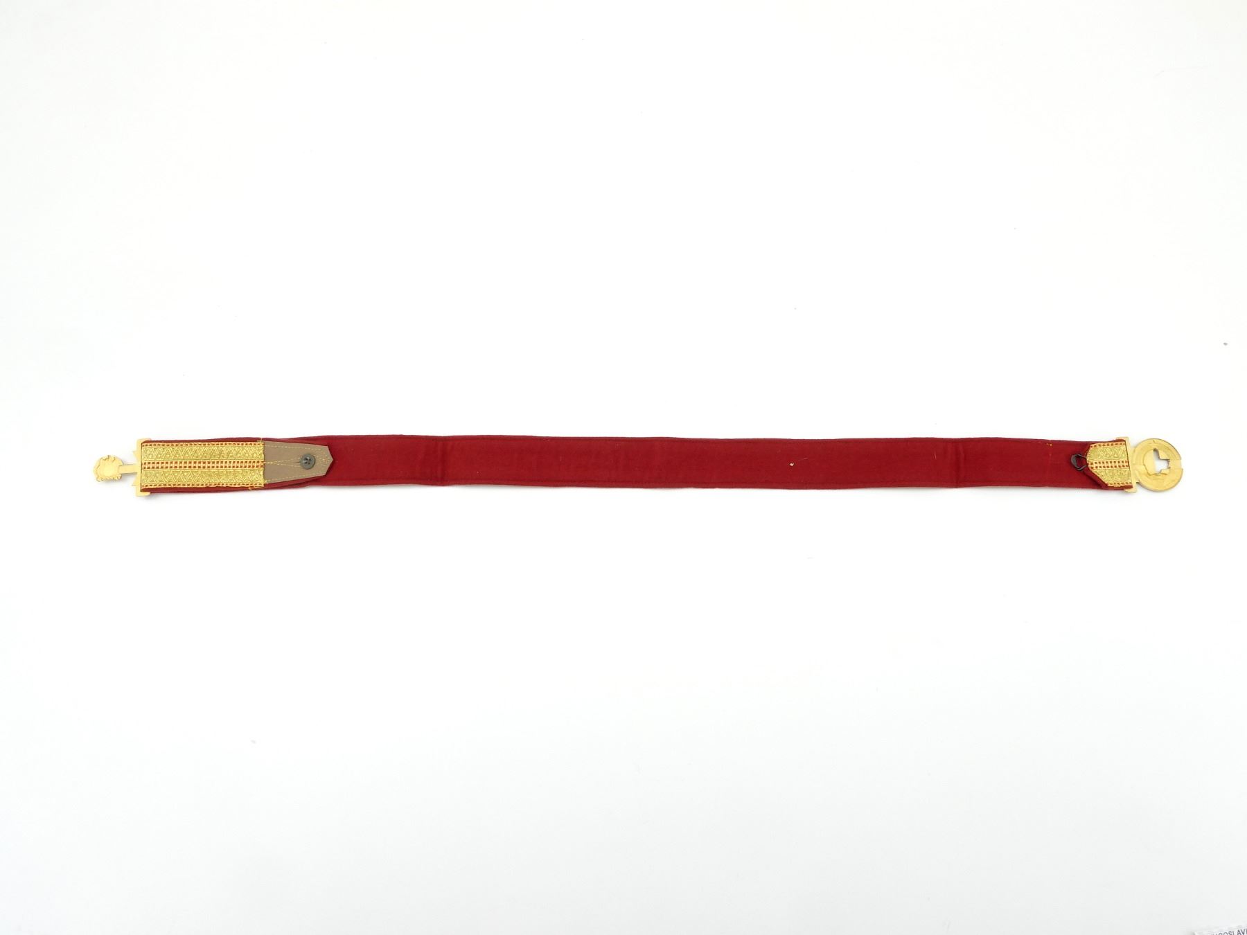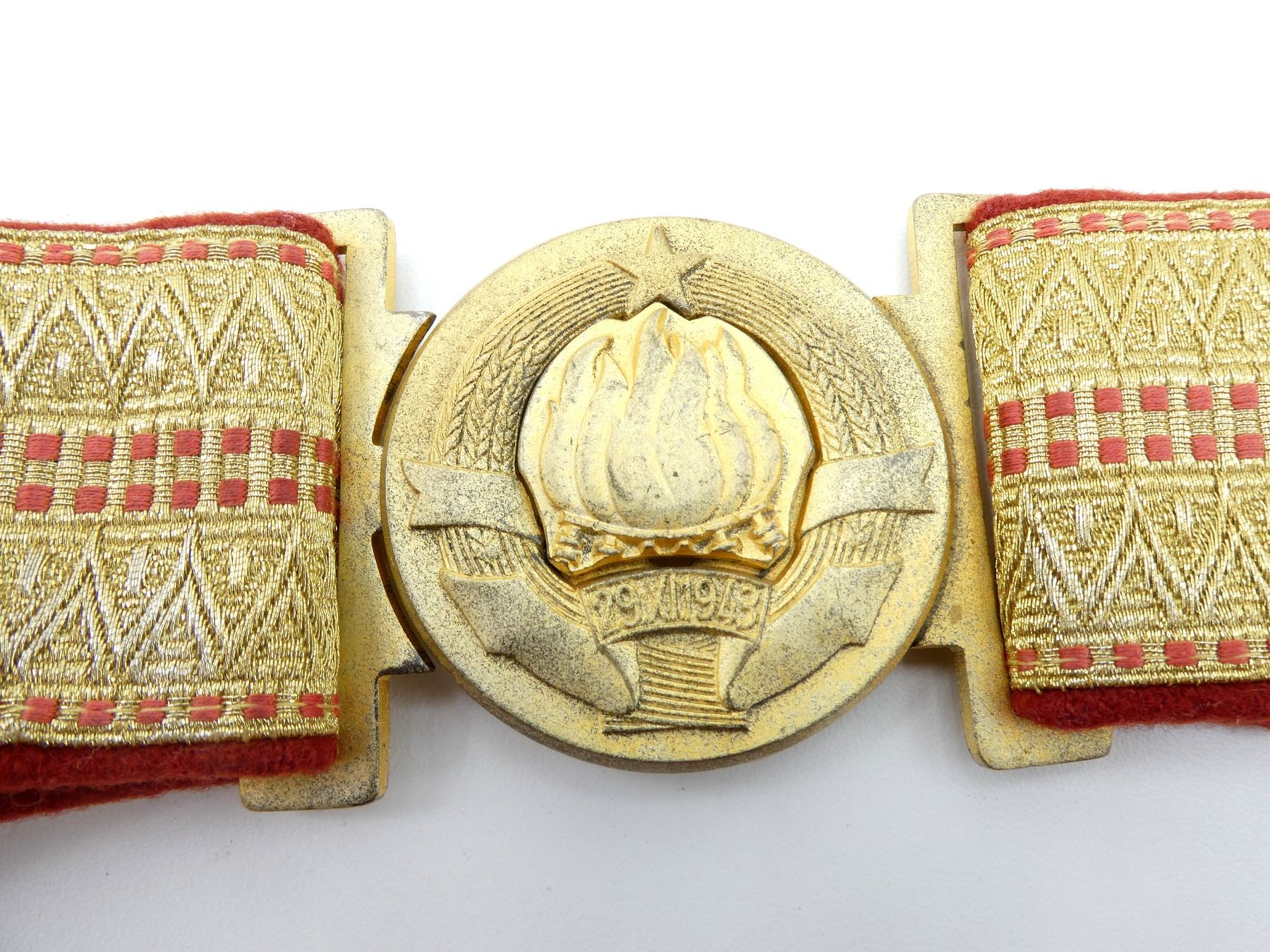 (1) RED WOOL BELT WITH GOLD COLOURED DECORATIVE TRIM, GOLD COLOURED BELT BUCKLE WITH THE EMBLEM OF YUGOSLAVIA (SIX TORCHES BURNING AS ONE) WITH THE DATE "29.XI.1943" REFERRING TO THE SECOND SESSION OF THE ANTI-FASCIST COUNCIL FOR THE NATIONAL LIBERATION OF YUGOSLAVIA, NO VISIBLE MARKINGS / MAKER'S MARKS ON BELT / BUCKLE, OVERALL LENGTH APPROX. 41.75". SEE PHOTOS.
