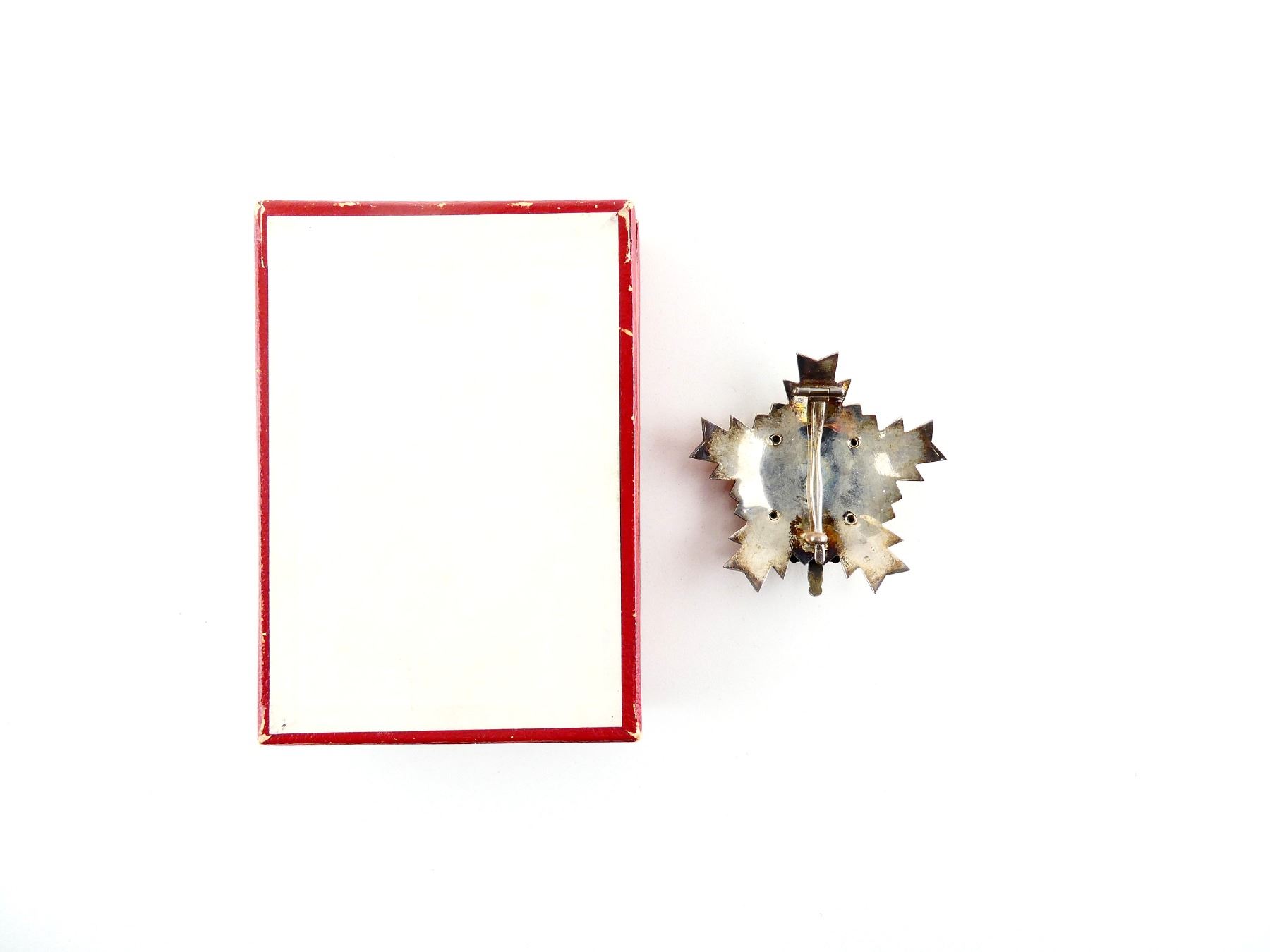 (1) ORDER OF THE PEOPLE'S ARMY WITH SILVER STAR, ENAMELED FRONT, FLAT TAPERED PIN BACKING, MAKER'S MARKS ON BACK, RED CASE WITH GOLD WRITING. SEE PHOTOS.