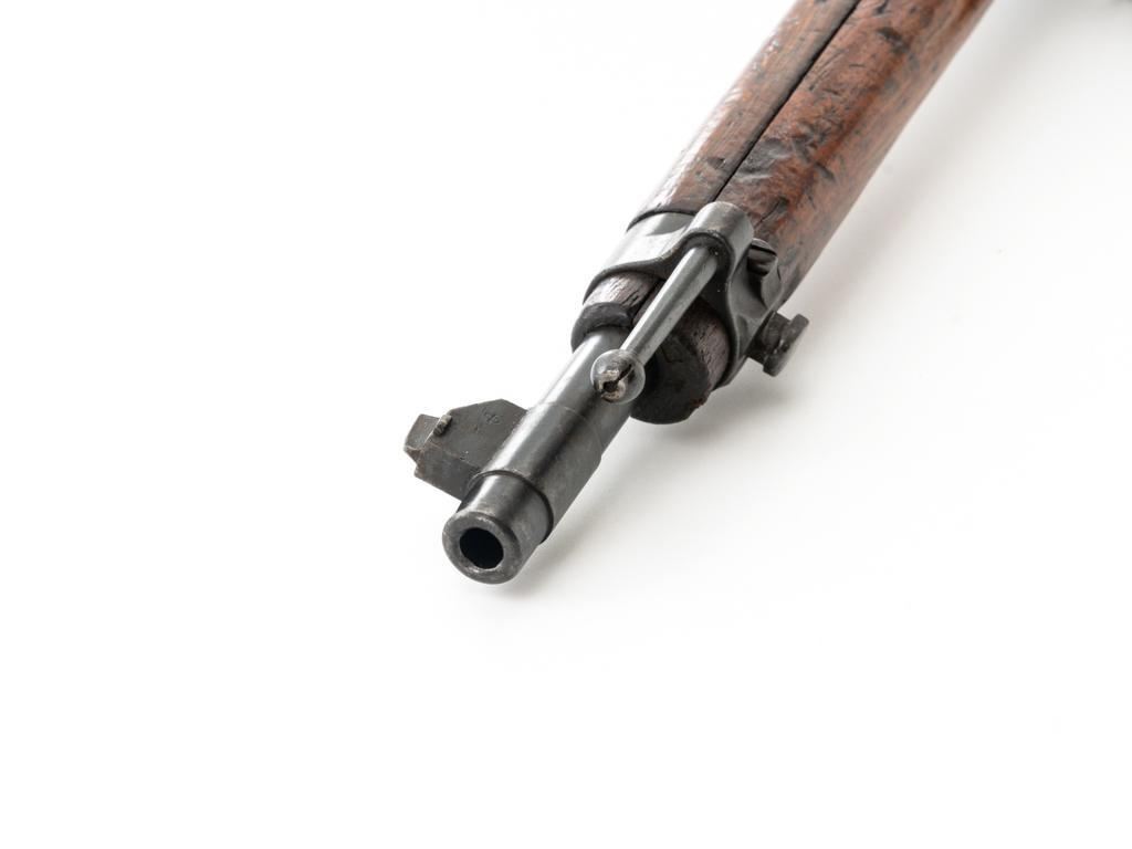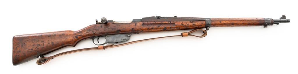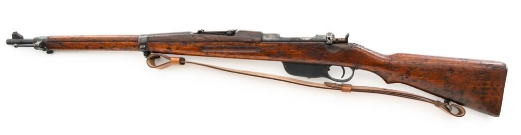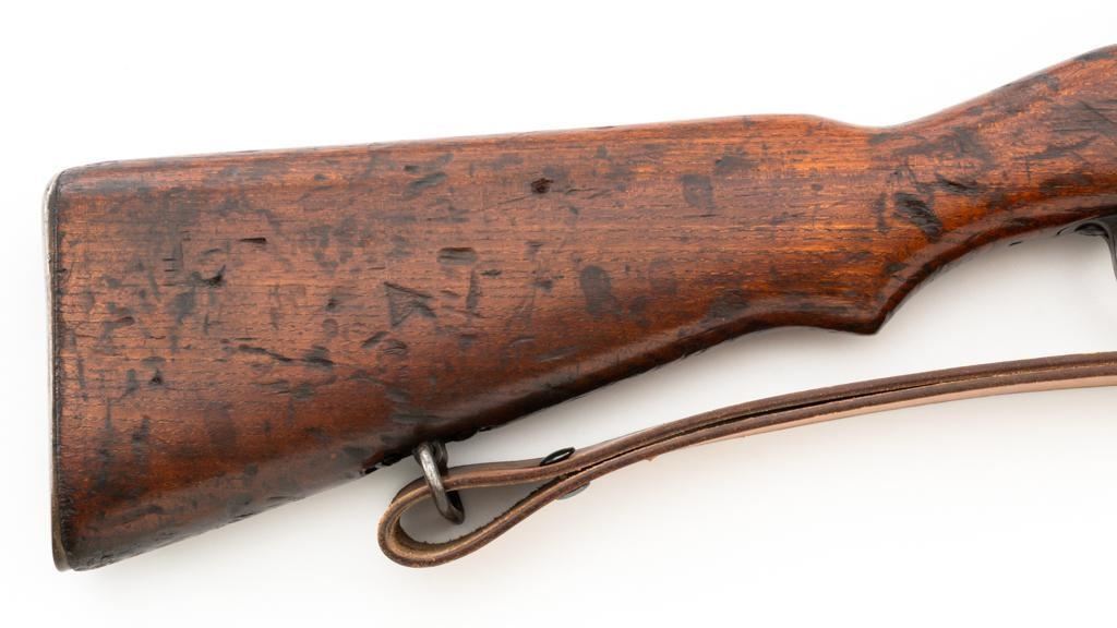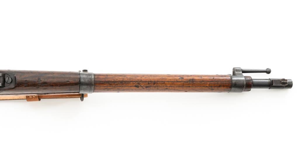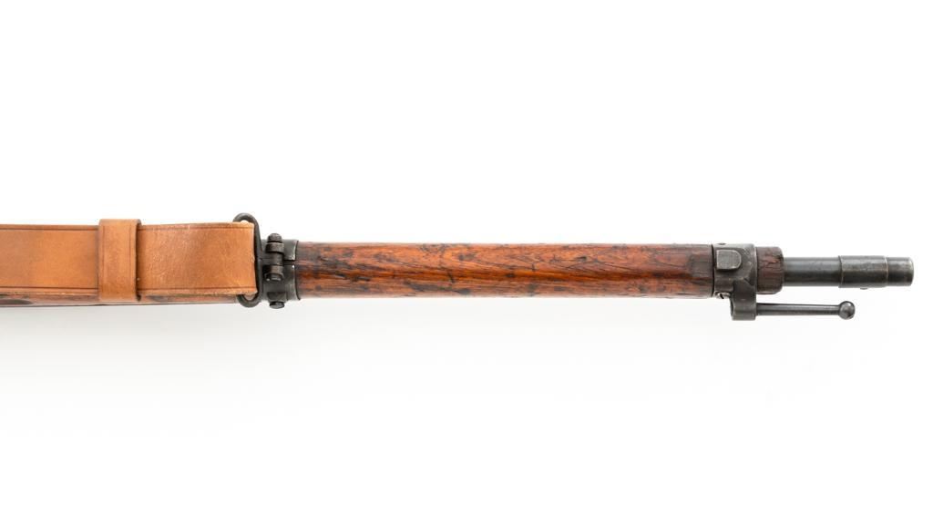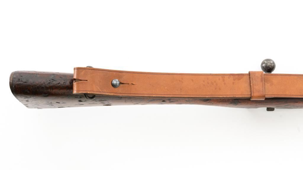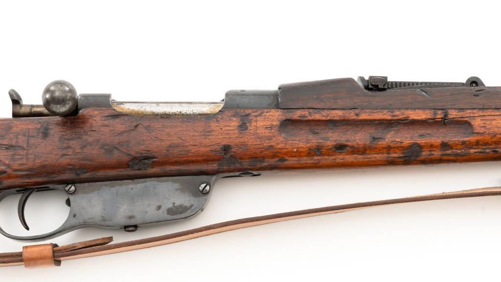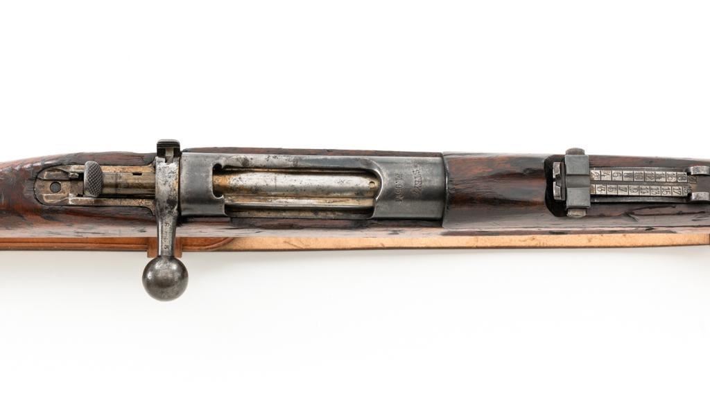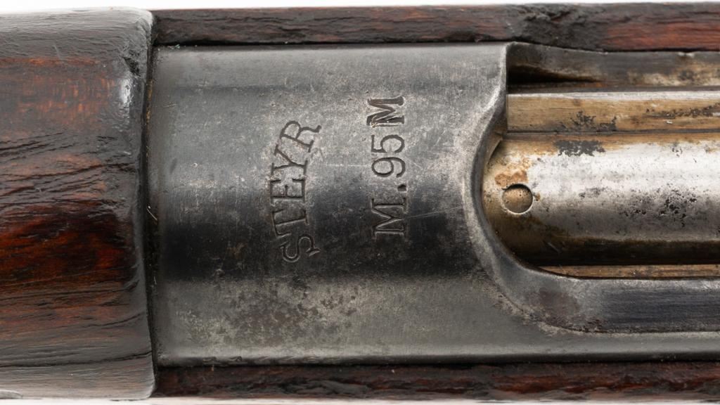 Yugoslavian Converted Steyr Model 95M Mannlicher Straight Pull Rifle, #114465, 8x57mm cal., 23.5" barrel, blued finish with bright bolt assembly, hardwood stock and handguard, dovetailed inverted-"V" front sight, and adjustable tangent rear sight with "V"-notched groove, graduated to 2000 meters. Includes a brown leather sling, stamped "STOLLA/WIEN", in very good used condition. Rifle was converted by the Kragujevac Arsenal into its present configuration by fitting a Model 1924 Mauser barrel, sights, handguard, and magazine. An internal steel clip is in place inside the magazine. Top of the receiver ring is marked "STEYR/M.95". Numbered parts do not match. No visible import marks. Condition overall is good, retaining approx. 65%-70% thinning and toning blue, with wear and patina especially to the rear sight, receiver, and buttplate. Bolt assembly has areas of rust patina. Wood is fair, showing numerous dents and scratches. Action operates smoothly. Bore is bright with very good rifling. Est.: $400-$700. (C&R)
