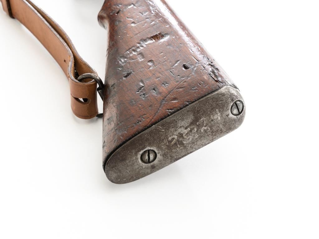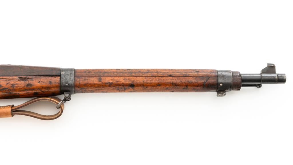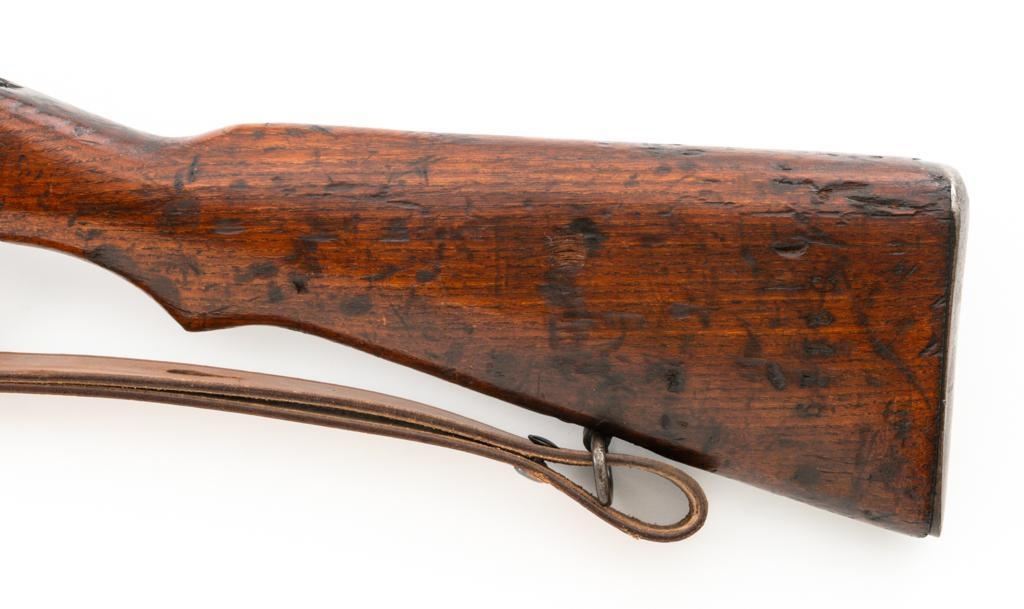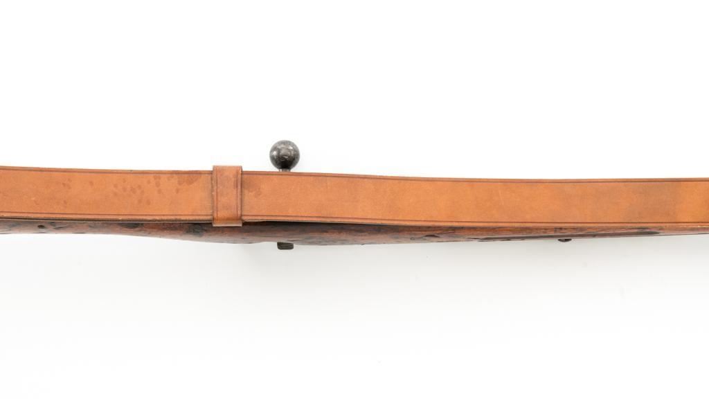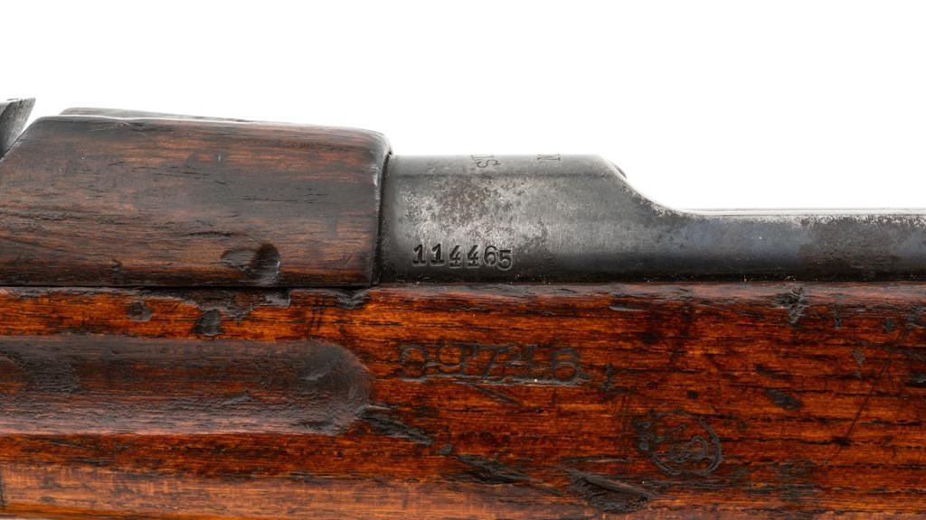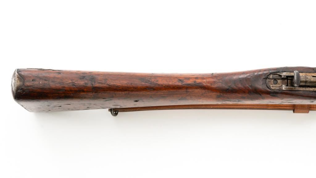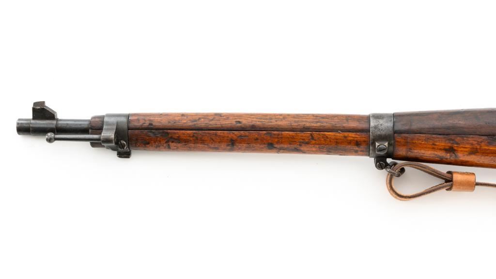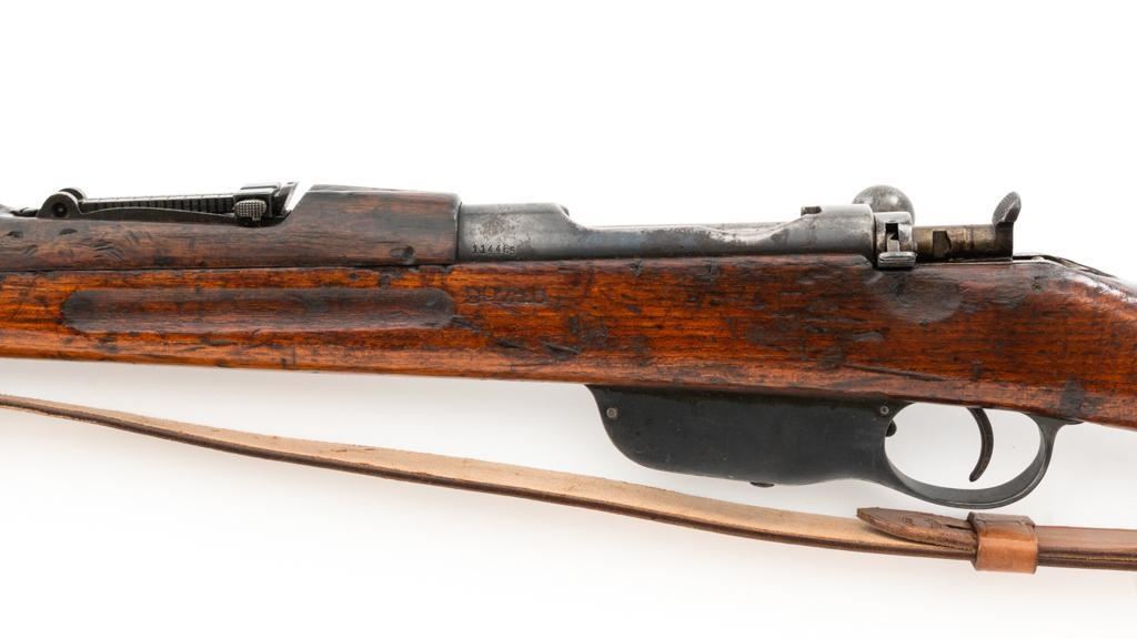 Yugoslavian Converted Steyr Model 95M Mannlicher Straight Pull Rifle, #114465, 8x57mm cal., 23.5" barrel, blued finish with bright bolt assembly, hardwood stock and handguard, dovetailed inverted-"V" front sight, and adjustable tangent rear sight with "V"-notched groove, graduated to 2000 meters. Includes a brown leather sling, stamped "STOLLA/WIEN", in very good used condition. Rifle was converted by the Kragujevac Arsenal into its present configuration by fitting a Model 1924 Mauser barrel, sights, handguard, and magazine. An internal steel clip is in place inside the magazine. Top of the receiver ring is marked "STEYR/M.95". Numbered parts do not match. No visible import marks. Condition overall is good, retaining approx. 65%-70% thinning and toning blue, with wear and patina especially to the rear sight, receiver, and buttplate. Bolt assembly has areas of rust patina. Wood is fair, showing numerous dents and scratches. Action operates smoothly. Bore is bright with very good rifling. Est.: $400-$700. (C&R)