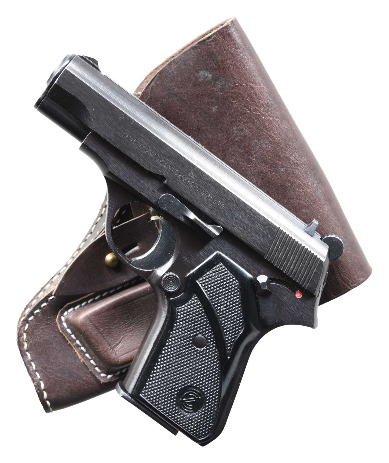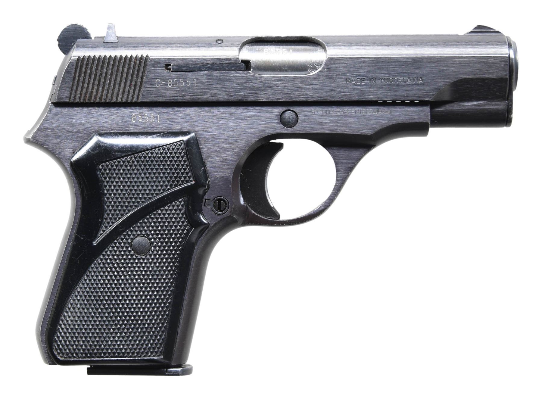 Cal. 32 ACP. S# 85551. Bbl. 3 3/4". Blade front sight. V-notch rear sight. Matching numbers on frame, slide & bbl. Right side of frame has R Guns import marking. Right side of slide has "MADE IN YUGOSLAVIA" marking. Blued finish. Checkered black grips. MAGS: 2-8 rd. UNATTACHED ACCESSORIES: white cardboard box that is matching numbered in marker with holster & bore brush. CONDITION: grips show some checkering point & handling wear. Metal retains 97% blue with some light edge wear & handling marks. Action functions properly when hand cycled. Very good bore with strong rifling. (25-3387/MJC). MODERN. $300-400.